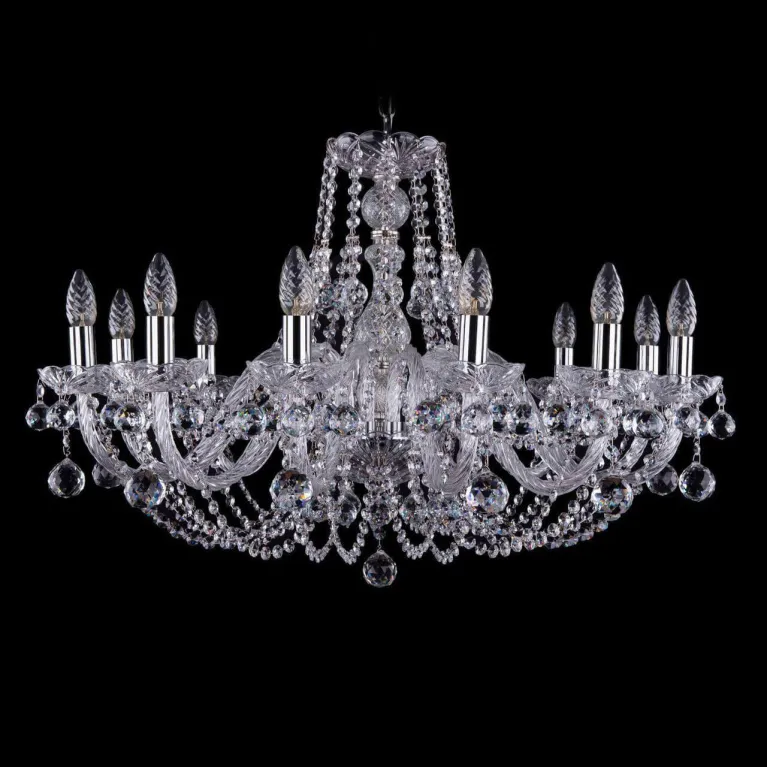 Люстра оснащена 12 лампами, что обеспечивает яркое и равномерное освещение пространства. Тип цоколя E14 позволяет использовать как традиционные лампы накаливания, так и энергосберегающие светодиодные, что предоставляет максимальную гибкость в выборе источников света.