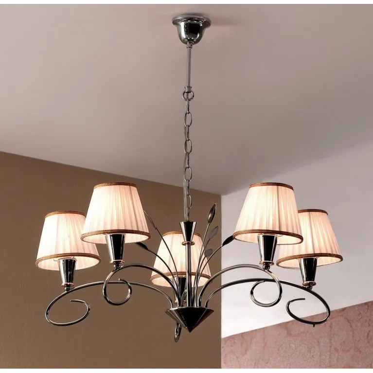 Люстра оснащена пятью источниками света с цоколем E14, что позволяет использовать различные типы ламп, включая энергосберегающие и светодиодные. Суммарная мощность ламп составляет 300 Вт, что обеспечивает яркое и равномерное освещение пространства.