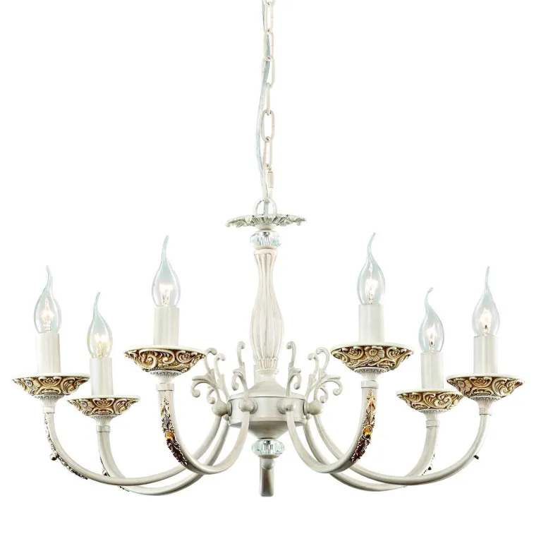 Люстра оснащена пятью лампами, что обеспечивает яркое и равномерное освещение пространства. Она идеально подходит для гостиной, столовой или спальни, создавая комфортную и уютную атмосферу. Основание изготовлено из прочного металла, что гарантирует долговечность и надежность конструкции.