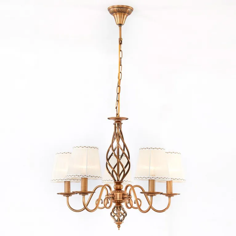 Люстра оснащена пятью лампами, которые могут быть различного типа (накаливания, светодиодные, энергосберегающие), что позволяет выбирать источники света в зависимости от ваших предпочтений и потребностей. Суммарная мощность ламп составляет 300 Вт, что обеспечивает яркое и равномерное освещение пространства.
