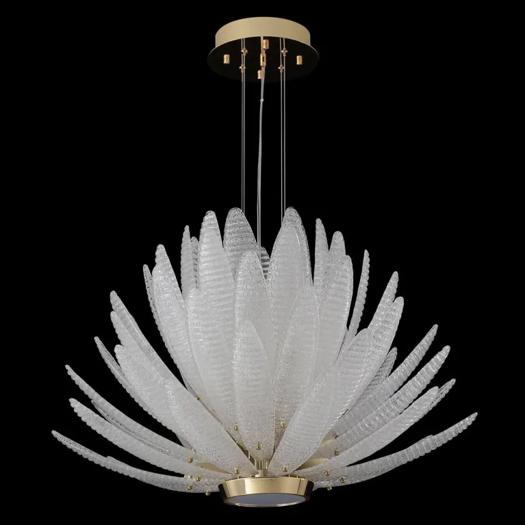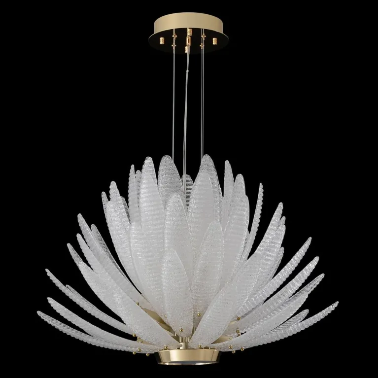 Преобладающий цвет плафонов: Прозрачный, арматуры: Золото; материал изготовления арматуры: Металл, размеры, мм: / высота 2980 / диаметр 735. Общая мощность – 75 Ватт. Основной тип ламп, предусмотренный производителем: Накаливания с цоколем E14. В зависимости от предпочтений можно использовать лампы теплового, холодного или нейтрального света, за исключением люстр с типом цоколя LED.