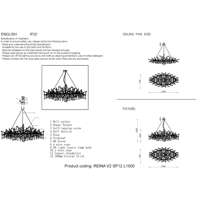 Преобладающий цвет плафонов: Прозрачный, арматуры: Золото; материал изготовления арматуры: Металл, размеры, мм: длина 1500 / ширина 750 / высота 650 / диаметр 1200. Общая мощность – 720 Ватт, а максимальная площадь освещения до 36 м2. Основной тип ламп, предусмотренный производителем: Накаливания с цоколем E14. В зависимости от предпочтений можно использовать лампы теплового, холодного или нейтрального света, за исключением люстр с типом цоколя LED.