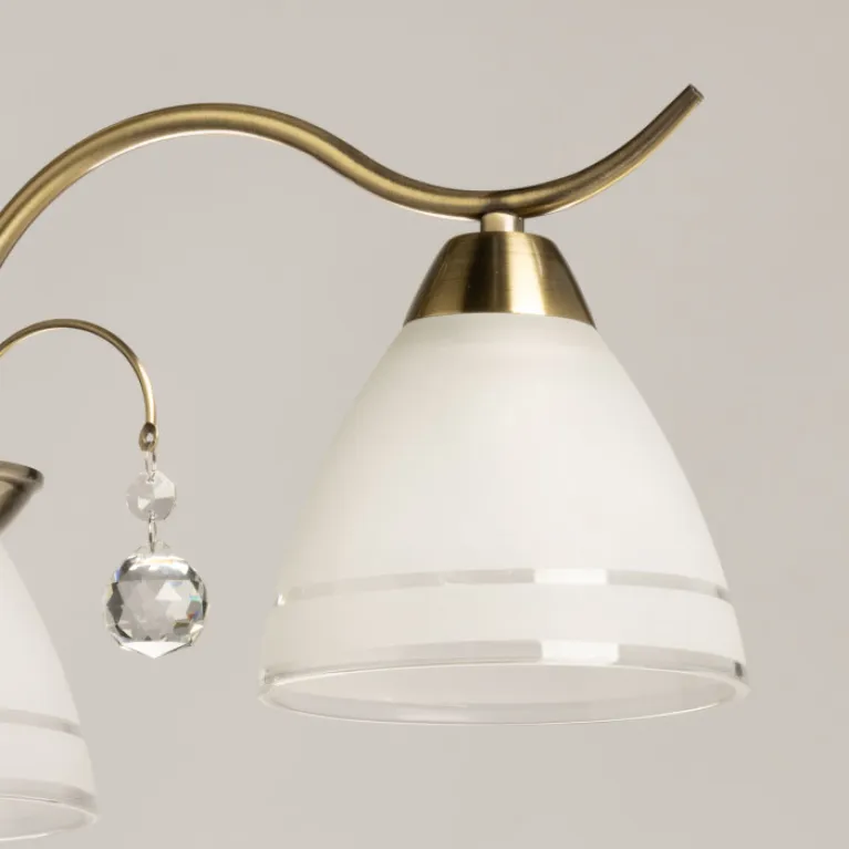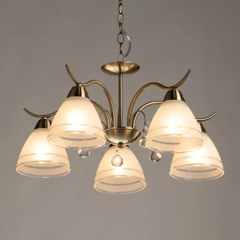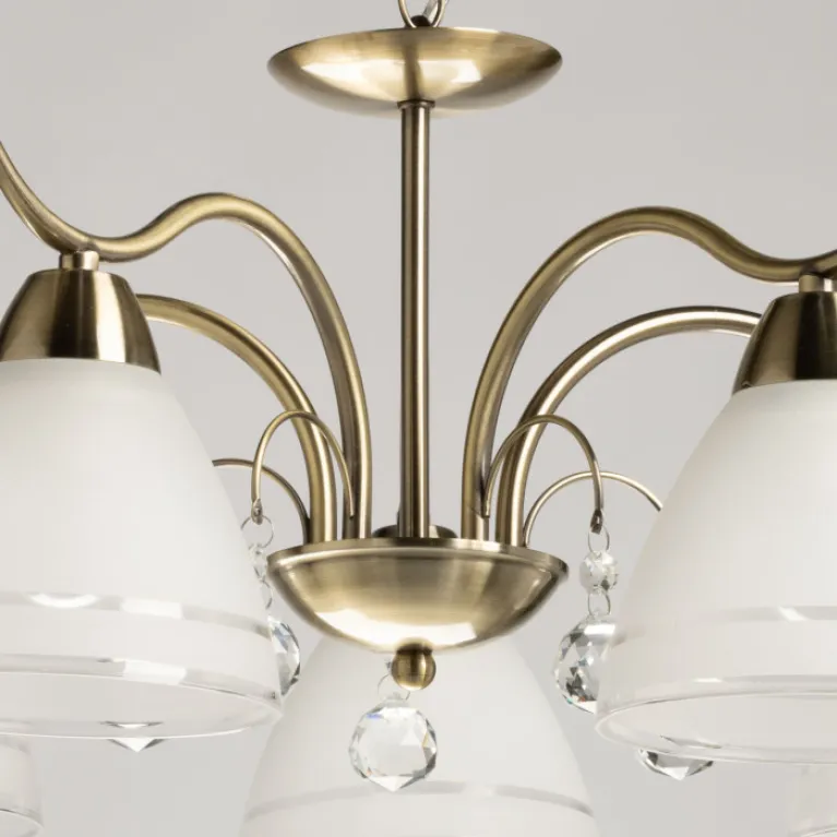 Преобладающий цвет плафонов: Белый, арматуры: Бронза; материал изготовления арматуры: Металл, размеры, мм: / высота 500 / диаметр 500. Общая мощность – 300 Ватт, а максимальная площадь освещения до 15 м2. Основной тип ламп, предусмотренный производителем: Накаливания с цоколем E27. В зависимости от предпочтений можно использовать лампы теплового, холодного или нейтрального света, за исключением люстр с типом цоколя LED.