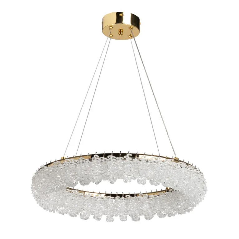 Преобладающий цвет плафонов: Прозрачный, арматуры: Золото; материал изготовления арматуры: Металл, размеры, мм: / высота 1140 / диаметр 510. Общая мощность – 90 Ватт, а максимальная площадь освещения до 20 м2. Основной тип ламп, предусмотренный производителем: Светодиодная с цоколем LED. В зависимости от предпочтений можно использовать лампы теплового, холодного или нейтрального света, за исключением люстр с типом цоколя LED.
