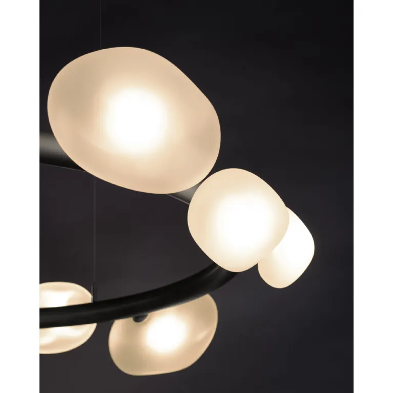 Преобладающий цвет плафонов: Белый, арматуры: Черный; материал изготовления арматуры: Металл, размеры, мм: / высота 230 / диаметр 910. Общая мощность – 20 Ватт. Основной тип ламп, предусмотренный производителем: Светодиодная с цоколем LED. В зависимости от предпочтений можно использовать лампы теплового, холодного или нейтрального света, за исключением люстр с типом цоколя LED.