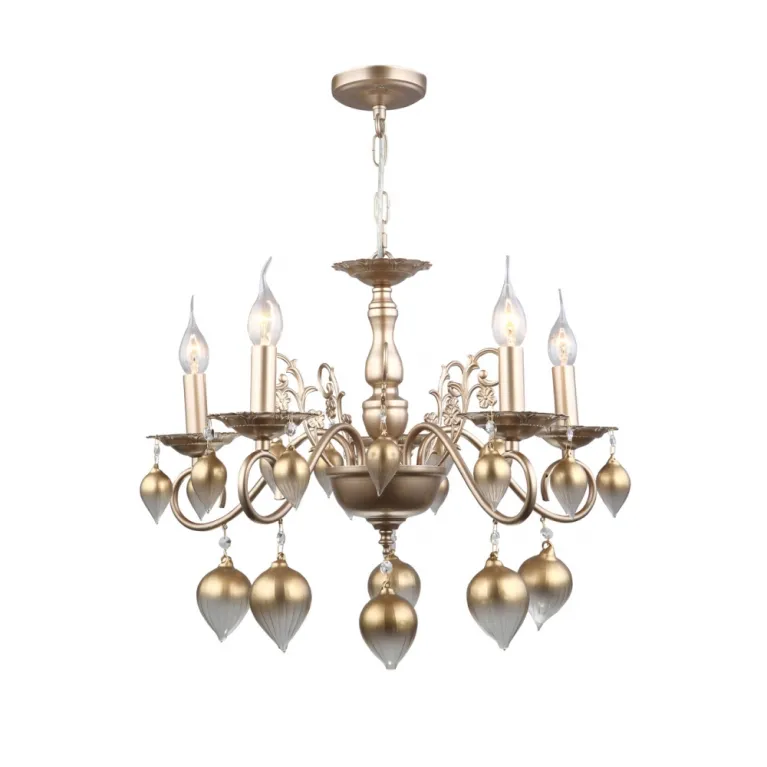 Люстра оснащена пятью лампами, что обеспечивает яркое и равномерное освещение пространства. Она идеально подходит для потолков высотой от 2,5 до 3,5 метров, что делает её универсальным решением для различных помещений. Основание выполнено из прочного металла, что гарантирует долговечность и надежность конструкции.