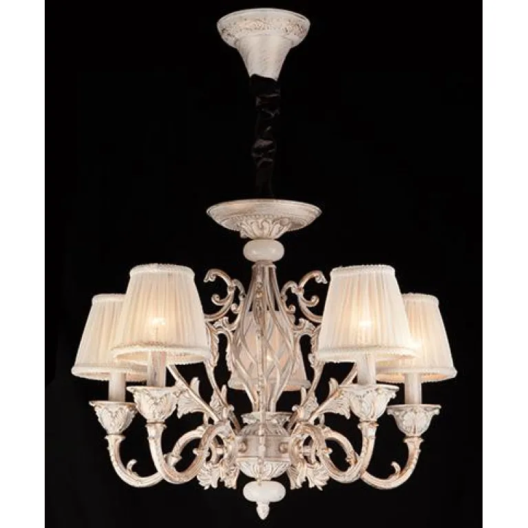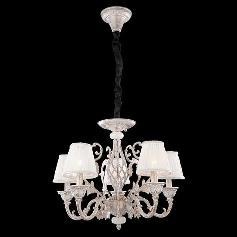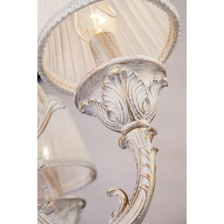 Люстра оснащена пятью лампами, что обеспечивает яркое и равномерное освещение пространства. Она идеально подходит для помещений с высокими потолками, добавляя вашему дому элегантности и утонченности. Основание выполнено из прочного металла с белым покрытием и элементами золотого цвета, придающими изделию роскошный вид.