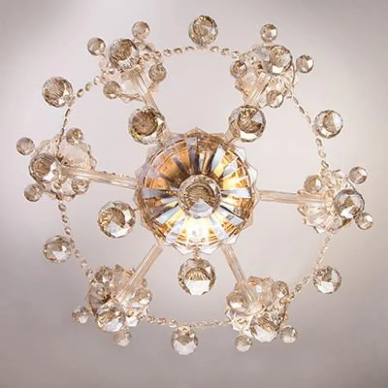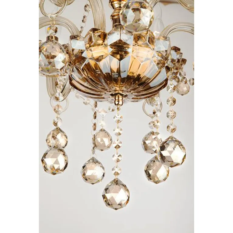 Корпус люстры выполнен из качественного металла с золотым покрытием, что придает ей роскошный и утонченный вид. Декоративные подвески из тонированного хрусталя придают светильнику неповторимую изящность и шарм.