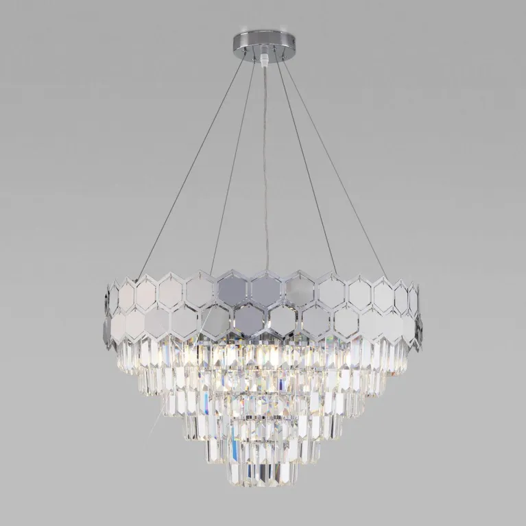 Подвесная люстра Eurosvet Ariana 10113/8 хром/прозрачный хрусталь строцкис имеет высоту 600 мм и диаметр 550 мм, что делает её оптимальным выбором для помещений с высокими потолками. Надежное крепление обеспечивает стабильность и безопасность в эксплуатации.