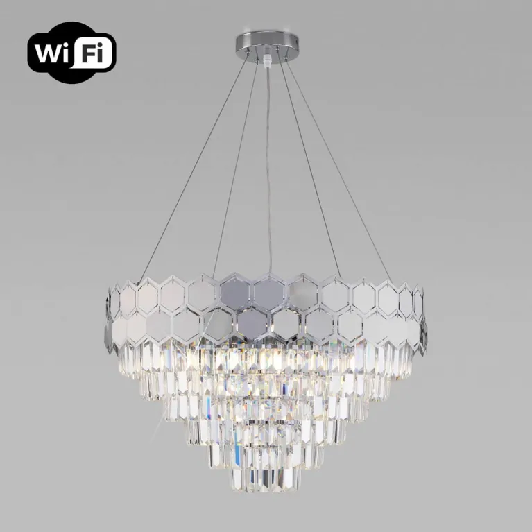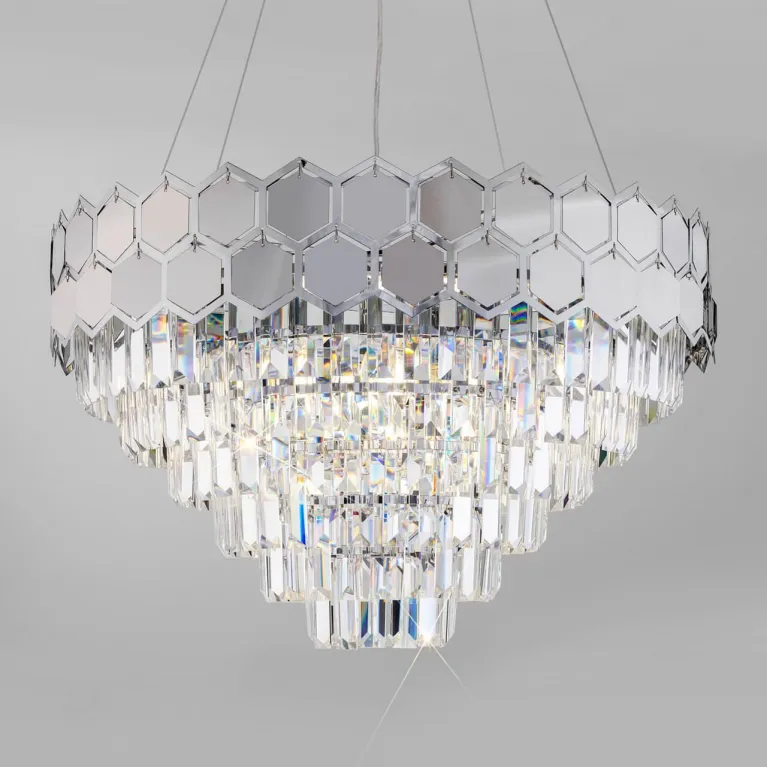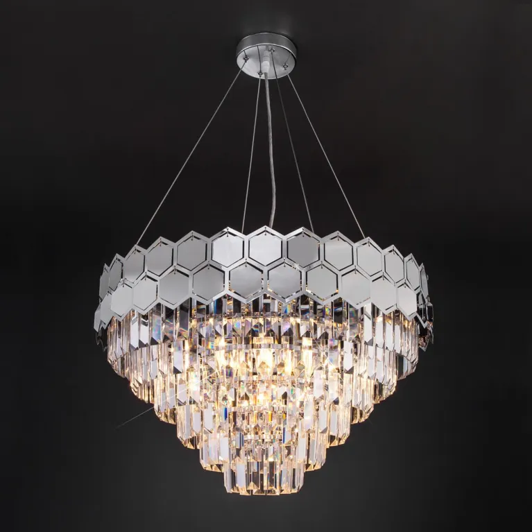Изготовленная из прочного металла и покрытая хромом, эта люстра отличается долговечностью и изысканным внешним видом. Прозрачные хрустальные элементы строцци придают ей неповторимый блеск и роскошь, делая её центральным элементом любого интерьера.