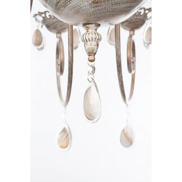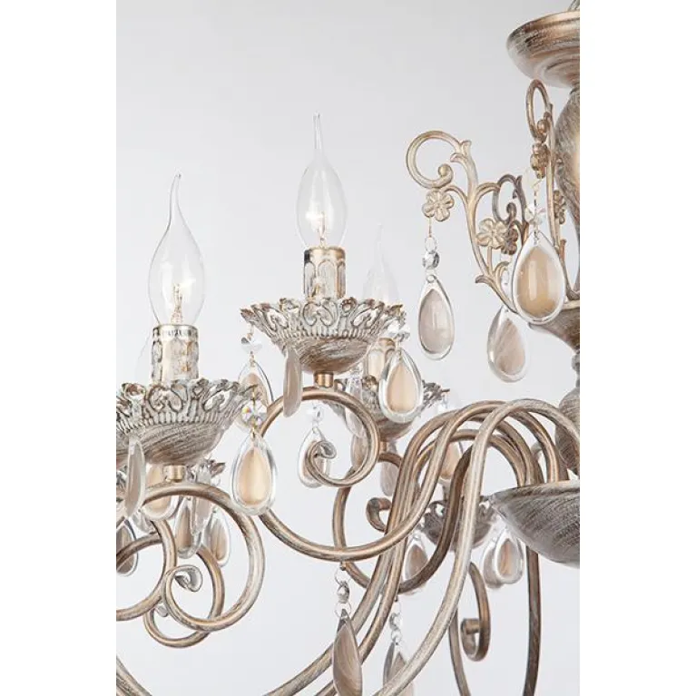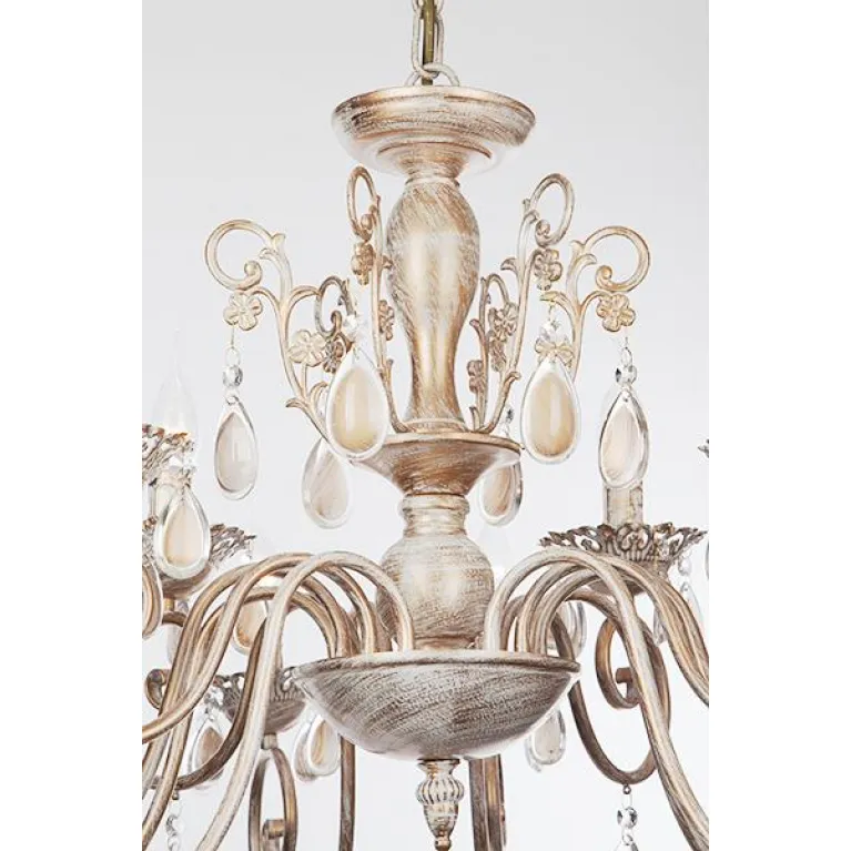 Корпус люстры выполнен из прочного металла с белым покрытием, которое прекрасно гармонирует с золочеными элементами, придавая изделию изысканный и утонченный вид. Подвесная конструкция позволяет регулировать высоту люстры, что делает её удобной в установке и использовании.