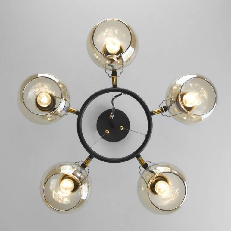 Люстра оснащена пятью лампами, что обеспечивает яркое и равномерное освещение пространства. Патрон E14 позволяет использовать как традиционные лампы накаливания, так и энергосберегающие или светодиодные лампы, предоставляя вам возможность выбирать источники света в зависимости от ваших предпочтений и потребностей.