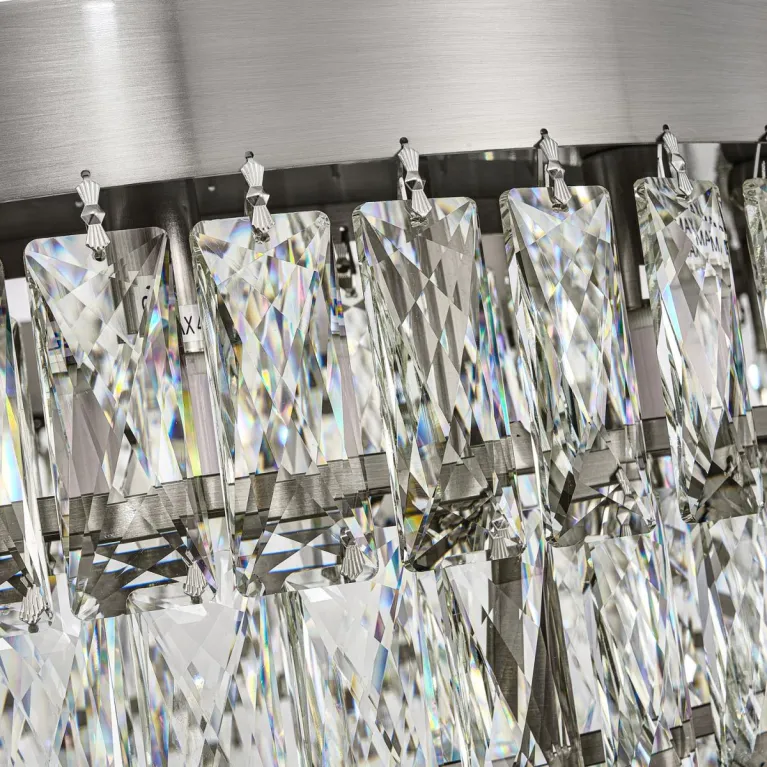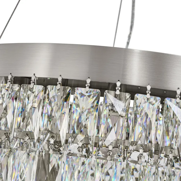 Преобладающий цвет плафонов: Прозрачный, арматуры: Никель; материал изготовления арматуры: Металл, размеры, мм: / высота 1760 / диаметр 600. Общая мощность – 480 Ватт, а максимальная площадь освещения до 36 м2. Основной тип ламп, предусмотренный производителем: Галогеновая с цоколем G9. В зависимости от предпочтений можно использовать лампы теплового, холодного или нейтрального света, за исключением люстр с типом цоколя LED.