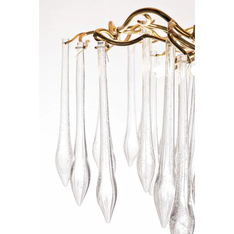 Преобладающий цвет плафонов: Прозрачный, арматуры: Золото; материал изготовления арматуры: Металл, размеры, мм: / высота 500 / диаметр 800. Общая мощность – 320 Ватт, а максимальная площадь освещения до 20 м2. Основной тип ламп, предусмотренный производителем: Галогеновая с цоколем G9. В зависимости от предпочтений можно использовать лампы теплового, холодного или нейтрального света, за исключением люстр с типом цоколя LED.