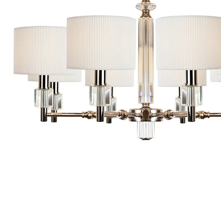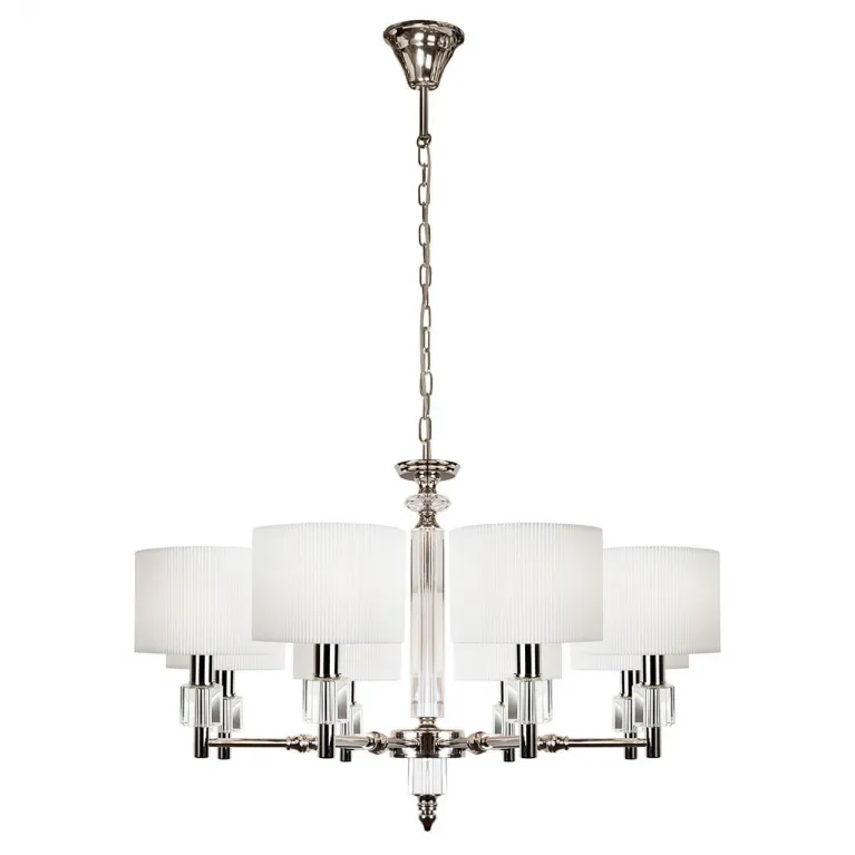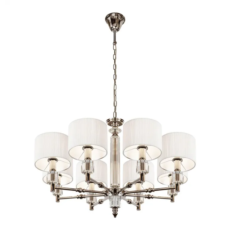 Люстра оснащена восемью лампами, что обеспечивает яркое и равномерное освещение пространства. Она выполнена в современном никелевом корпусе, который прекрасно гармонирует с различными стилями интерьера, от минимализма до хай-тека.
