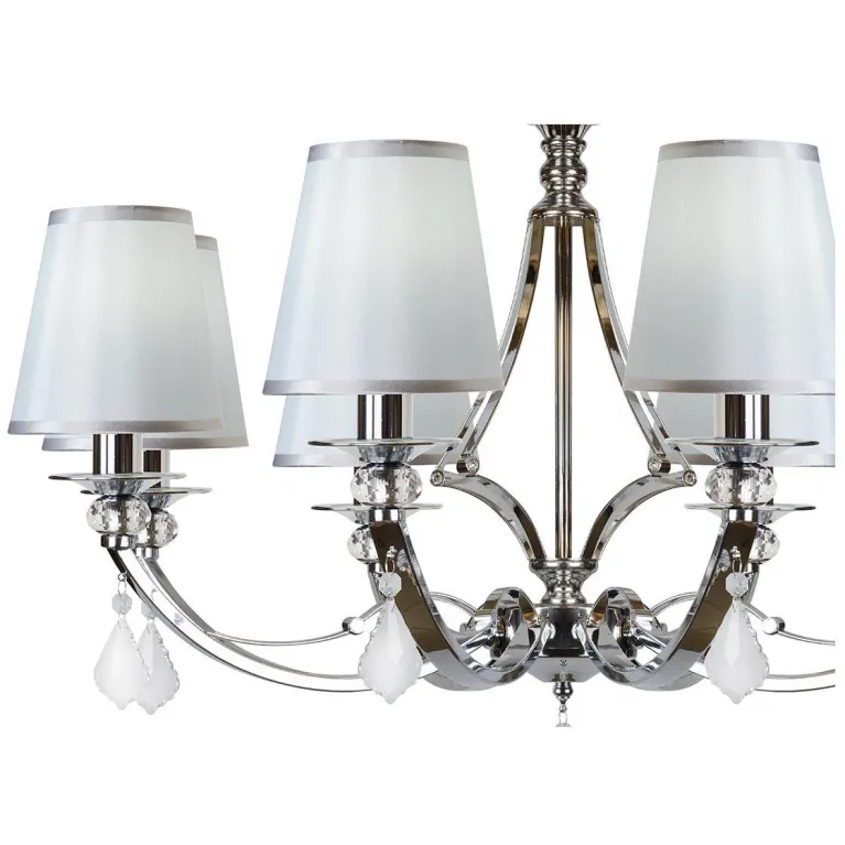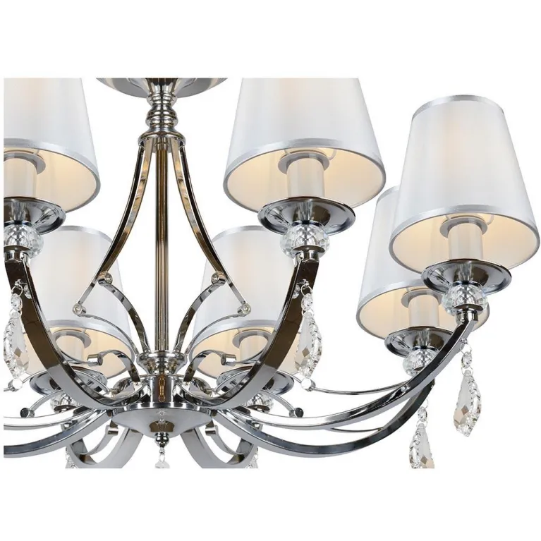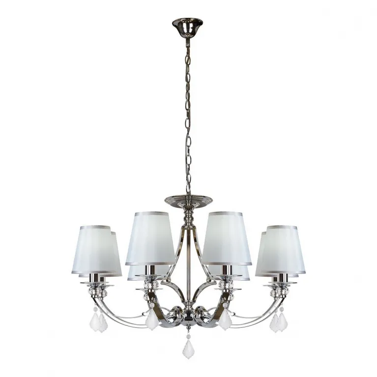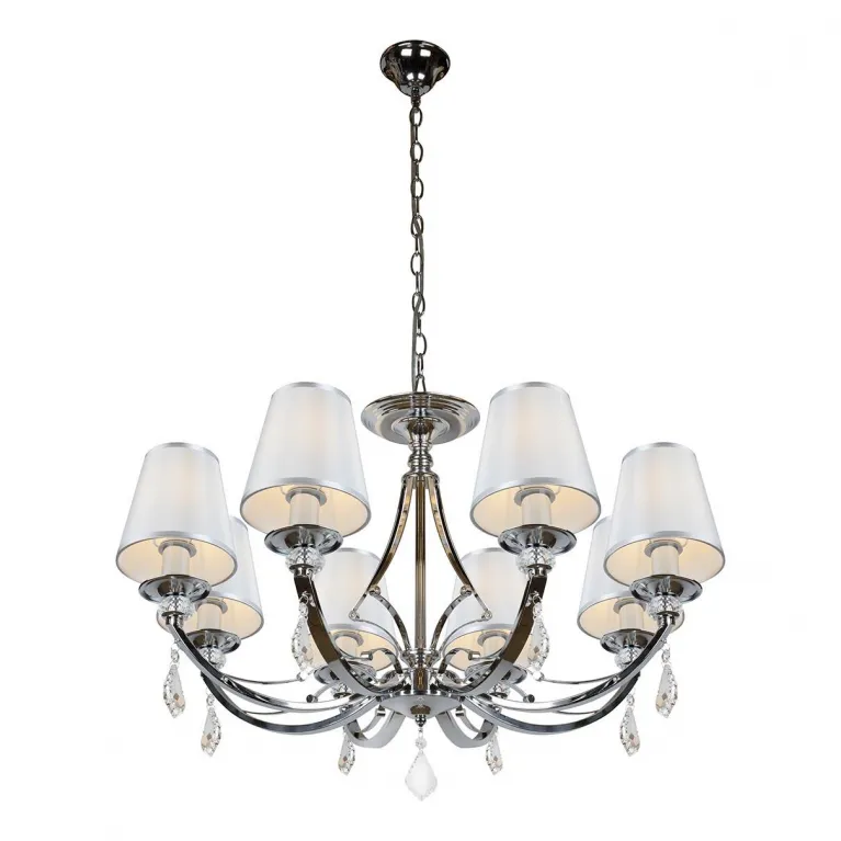 Люстра оснащена восемью лампами, что обеспечивает яркое и равномерное освещение пространства. Она идеально подходит для помещений с высокими потолками благодаря своей высоте в 120 см. Основание выполнено из прочного металла с хромированным покрытием, что придает светильнику современный и элегантный вид.