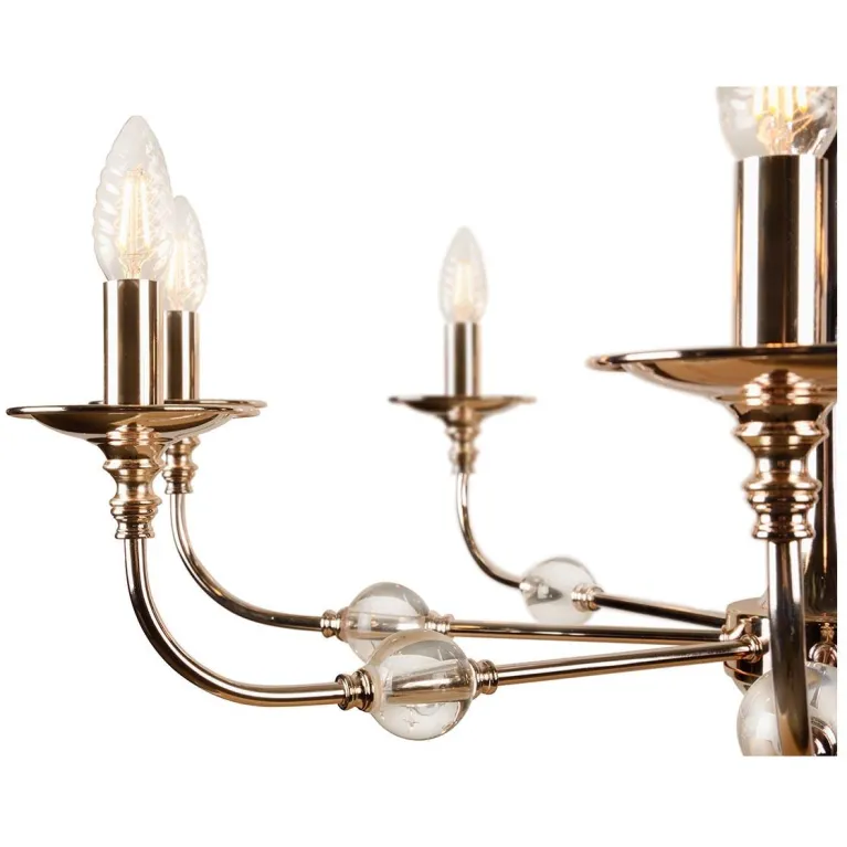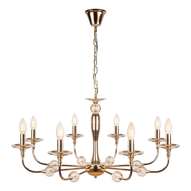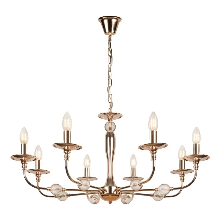 Люстра оснащена восьмью лампами, что обеспечивает яркое и равномерное освещение пространства. Она идеально подходит для просторных гостиной, столовой или спальни, добавляя помещению роскошь и стиль. Основание выполнено из прочного металла, что гарантирует долговечность и надежность конструкции.