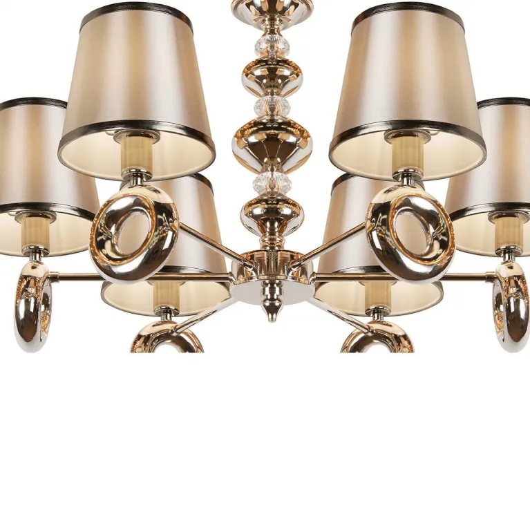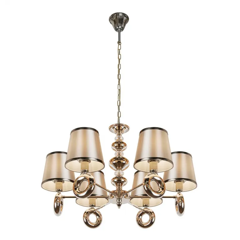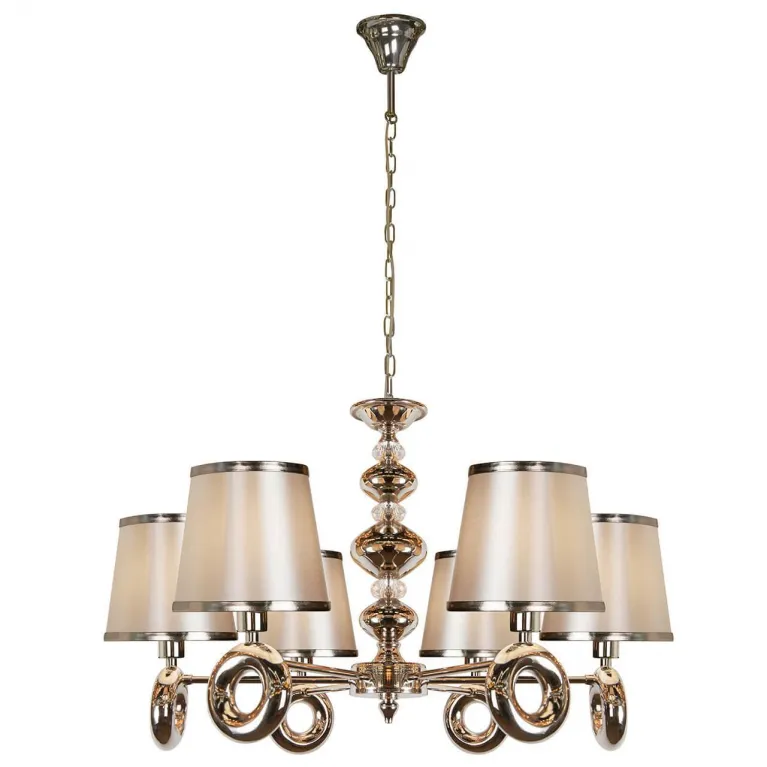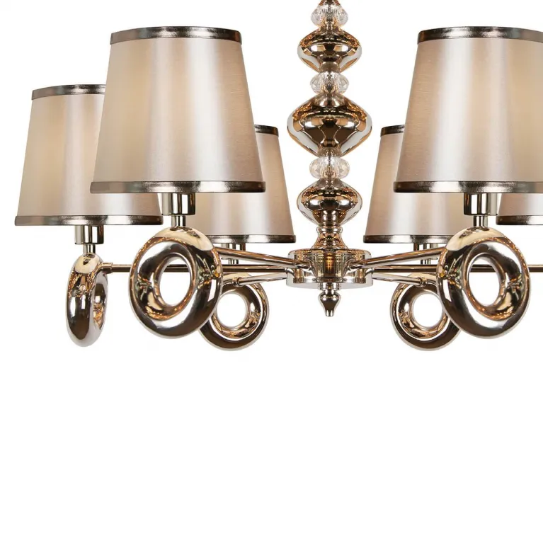 Люстра оснащена шестью лампами, что обеспечивает яркое и равномерное освещение пространства. Она идеально подходит для помещений с высокими потолками благодаря своей высоте в 120 см. Основание изготовлено из прочного металла с никелевым покрытием, которое придает изделию современный и стильный вид.