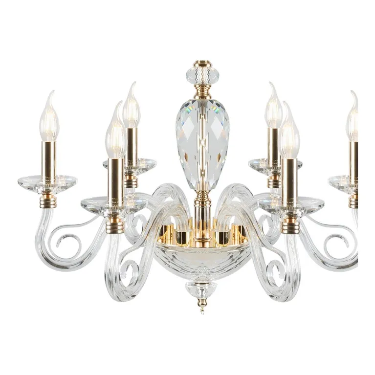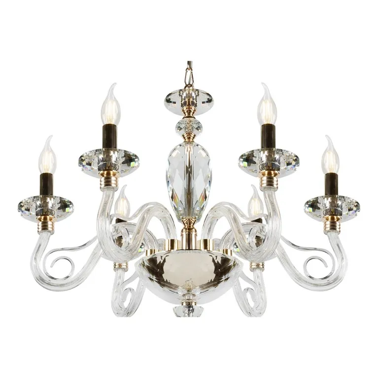 Преобладающий цвет арматуры: Золото; материал изготовления арматуры: Металл, размеры, мм: / высота 700 / диаметр 600. Общая мощность – 240 Ватт, а максимальная площадь освещения до 12 м2. Основной тип ламп, предусмотренный производителем: Накаливания с цоколем E14. В зависимости от предпочтений можно использовать лампы теплового, холодного или нейтрального света, за исключением люстр с типом цоколя LED.