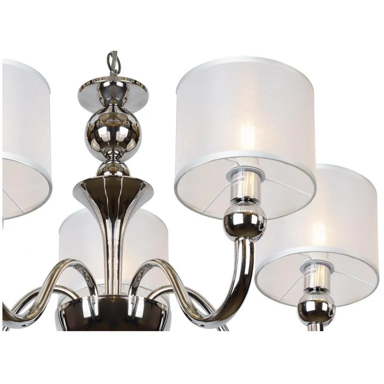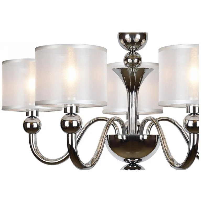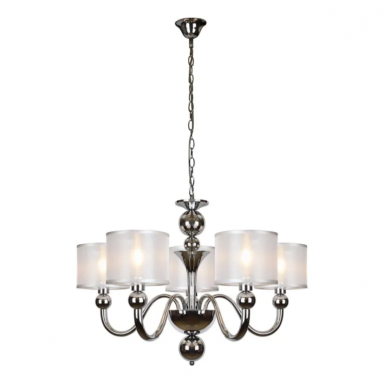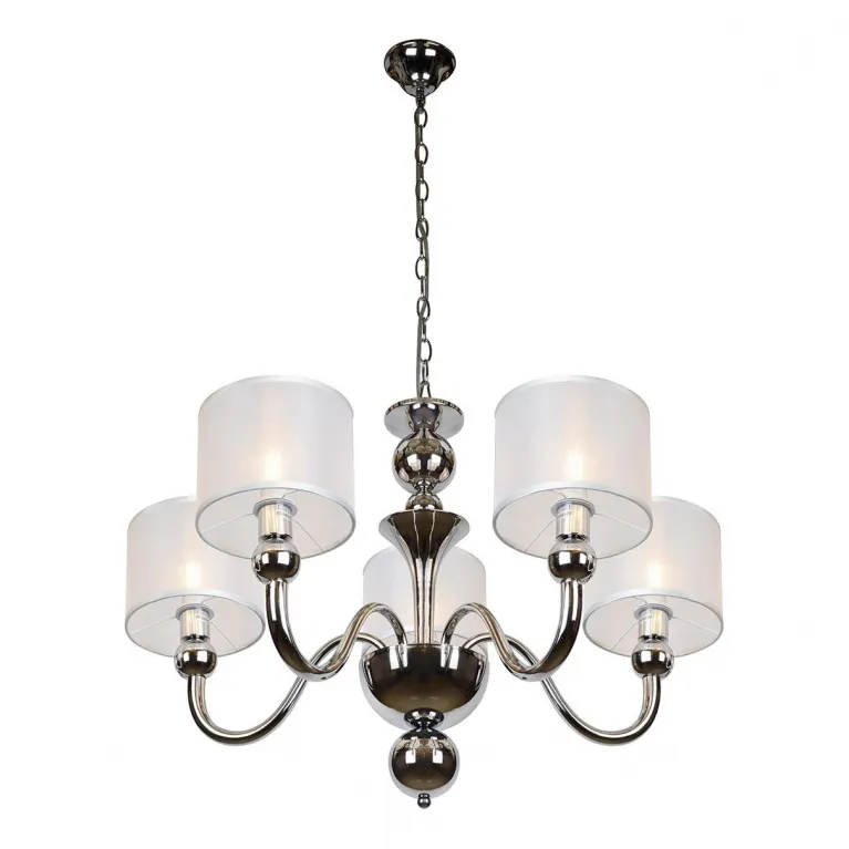 Люстра оснащена пятью лампами, что обеспечивает яркое и равномерное освещение пространства. Она идеально подходит для помещений с высокими потолками, так как её высота составляет 120 см. Основание выполнено из прочного металла с хромированным покрытием, придающим изделию современный и элегантный вид.