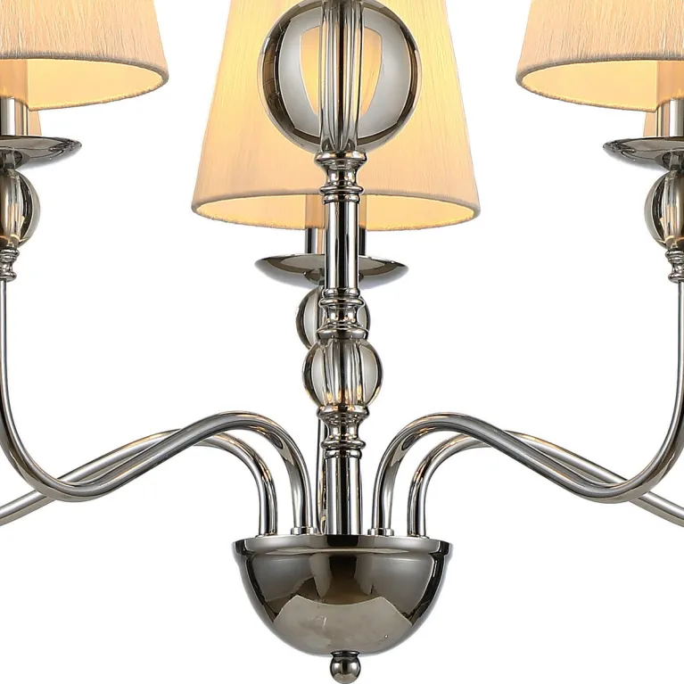 Преобладающий цвет плафонов: Белый, арматуры: Хром; материал изготовления арматуры: Металл, размеры, мм: / высота 550 / диаметр 632. Общая мощность – 200 Ватт, а максимальная площадь освещения до 10 м2. Основной тип ламп, предусмотренный производителем: Накаливания с цоколем E14. В зависимости от предпочтений можно использовать лампы теплового, холодного или нейтрального света, за исключением люстр с типом цоколя LED.