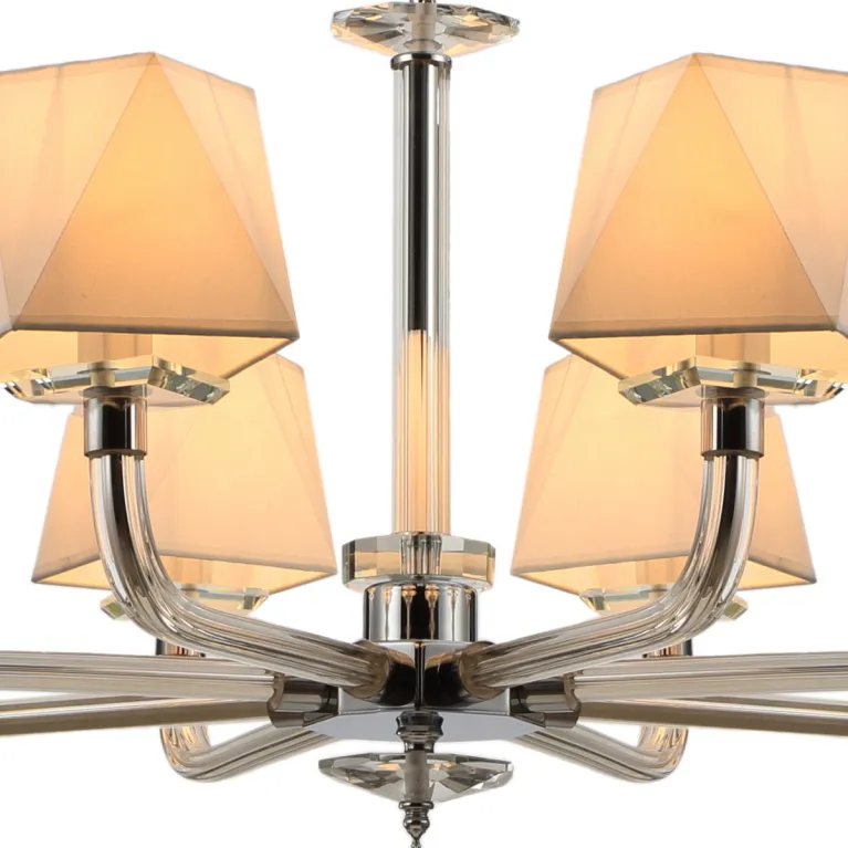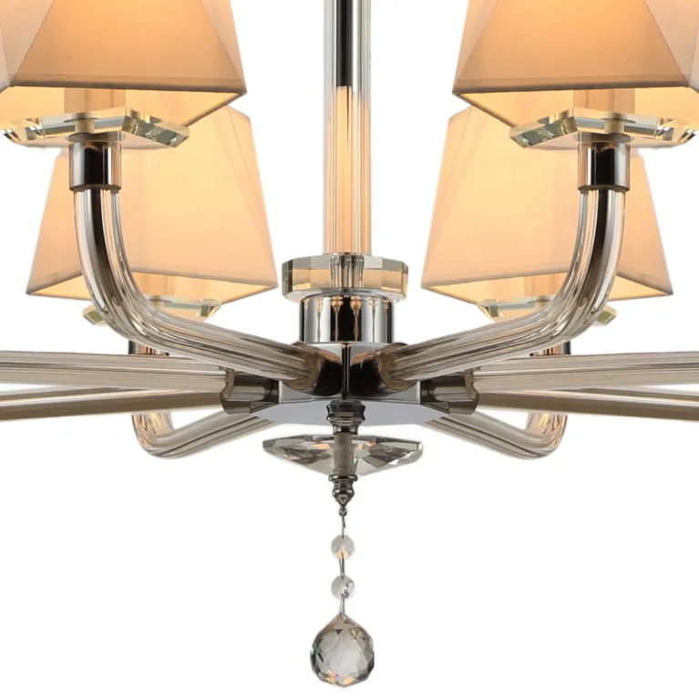 Преобладающий цвет плафонов: Белый, арматуры: Хром; материал изготовления арматуры: Металл, размеры, мм: / высота 575 / диаметр 865. Общая мощность – 320 Ватт, а максимальная площадь освещения до 16 м2. Основной тип ламп, предусмотренный производителем: Накаливания с цоколем E14. В зависимости от предпочтений можно использовать лампы теплового, холодного или нейтрального света, за исключением люстр с типом цоколя LED.