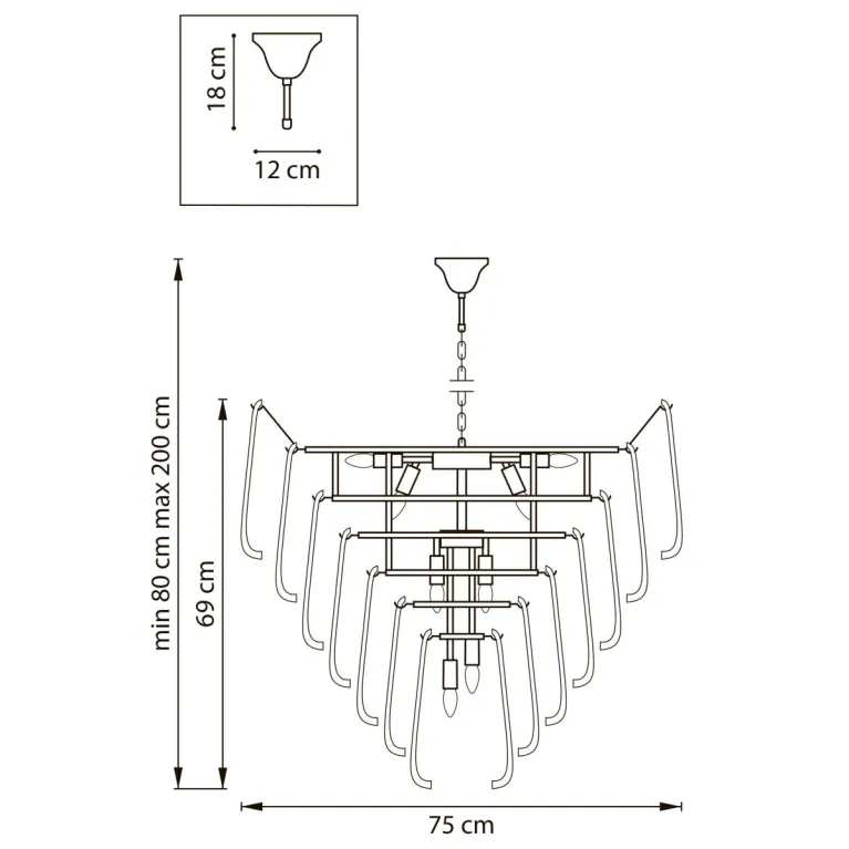 Преобладающий цвет плафонов: Прозрачный, арматуры: Золото; материал изготовления арматуры: Металл, размеры, мм: / высота 2000 / диаметр 750. Общая мощность – 6 Ватт. Основной тип ламп, предусмотренный производителем: Светодиодная с цоколем E14. В зависимости от предпочтений можно использовать лампы теплового, холодного или нейтрального света, за исключением люстр с типом цоколя LED.
