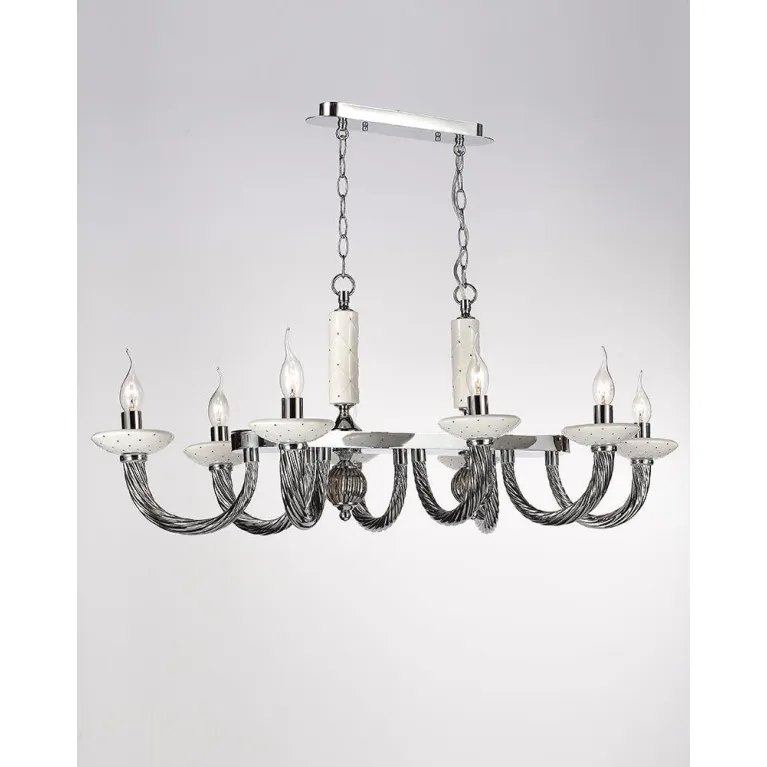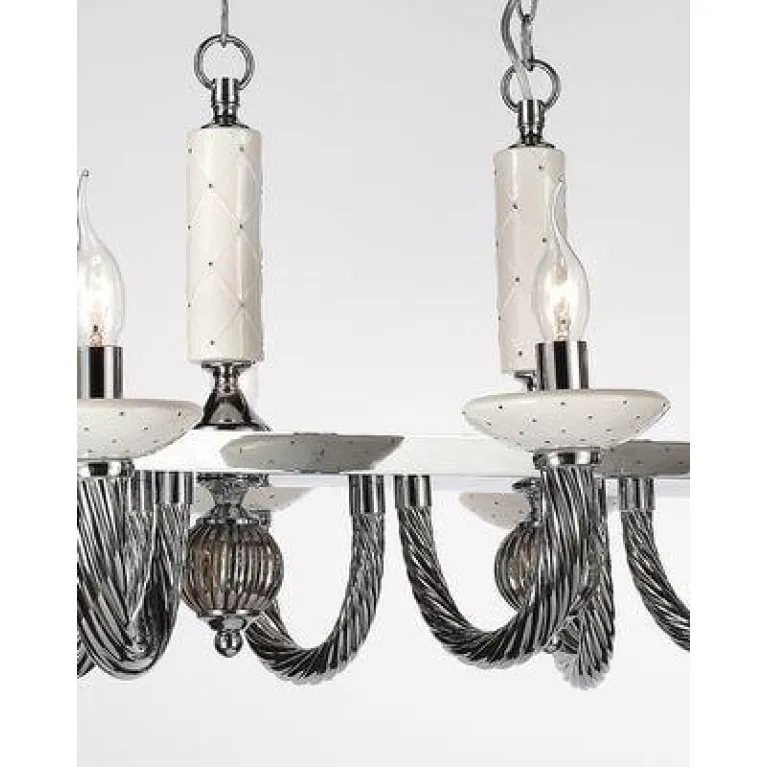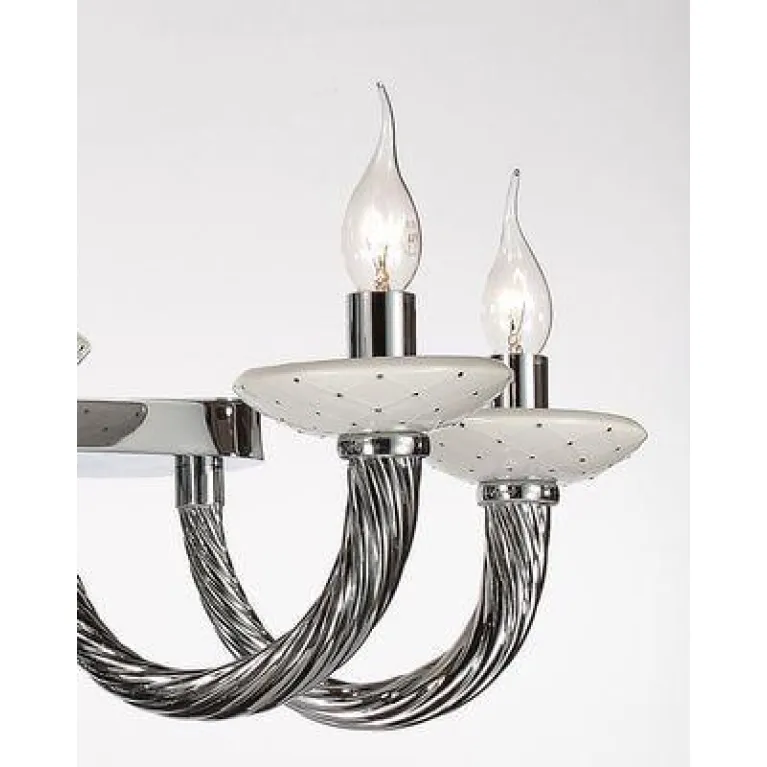 Люстра оснащена восемью лампами, что обеспечивает яркое и равномерное освещение пространства. Она идеально подходит для просторных гостиной, столовой или спальни, добавляя им стиль и роскошь. Основание выполнено из прочного металла с хромированным покрытием, что придает изделию современный и лаконичный вид.