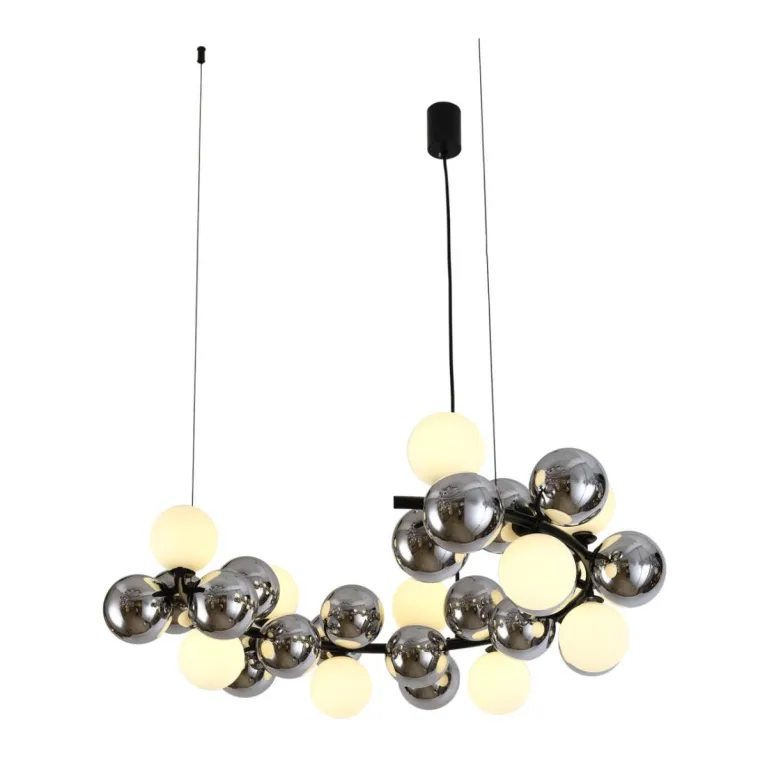 Преобладающий цвет плафонов: Белый, арматуры: Черный; материал изготовления арматуры: Металл, размеры, мм: / ширина 800 / высота 1500 / диаметр 700. Общая мощность – 440 Ватт. Основной тип ламп, предусмотренный производителем: Галогеновая с цоколем G9. В зависимости от предпочтений можно использовать лампы теплового, холодного или нейтрального света, за исключением люстр с типом цоколя LED.