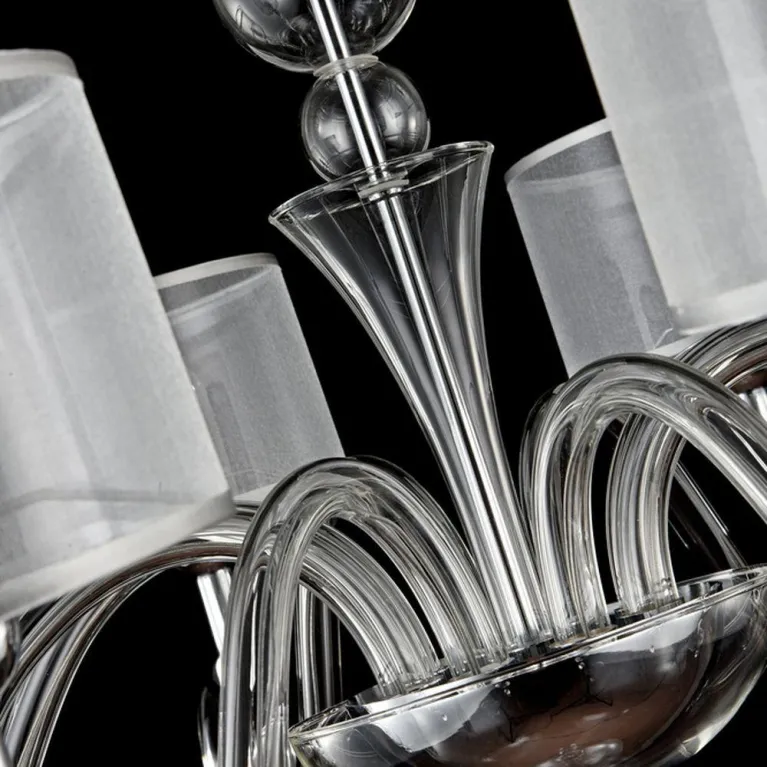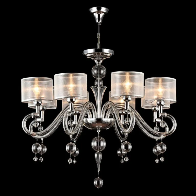 Люстра оснащена восемью лампами, что обеспечивает яркое и равномерное освещение. Она идеально подходит для просторных гостиных, столовых или спален, добавляя им света и простора. Основание выполнено из прочного металла, что гарантирует долговечность и надежность конструкции.