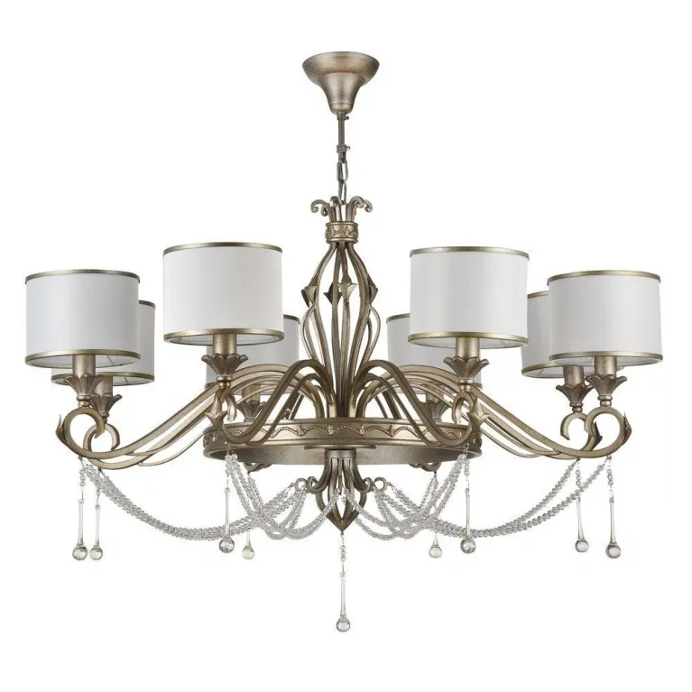 Люстра оснащена восемью лампами, что обеспечивает яркое и равномерное освещение пространства. Она идеально подходит для просторных гостиной, столовой или спальни, добавляя помещению роскоши и утонченности. Основание выполнено из прочного металла, что гарантирует долговечность и надежность конструкции.