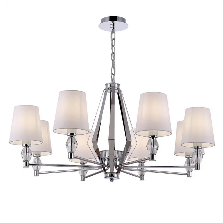 Люстра оснащена восемью лампами, что обеспечивает яркое и равномерное освещение пространства. Она прекрасно подходит для помещений с высокими потолками, так как её общая высота составляет 120 см. Корпус выполнен из прочного металла с черным хромированным покрытием, который придаёт изделию современный и элегантный вид.