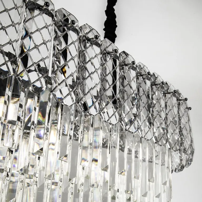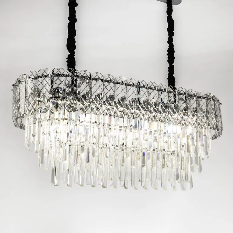 Преобладающий цвет плафонов: Прозрачный, арматуры: Хром; материал изготовления арматуры: Металл, размеры, мм: длина 980 / ширина 370 / высота 950 Общая мощность – 400 Ватт, а максимальная площадь освещения до 22 м2. Основной тип ламп, предусмотренный производителем: Накаливания с цоколем E14. В зависимости от предпочтений можно использовать лампы теплового, холодного или нейтрального света, за исключением люстр с типом цоколя LED.