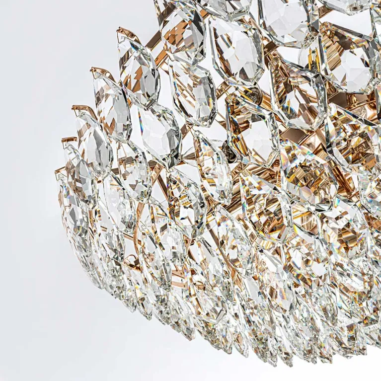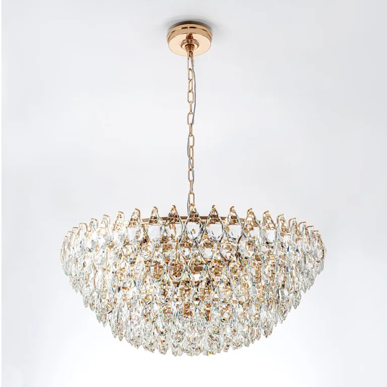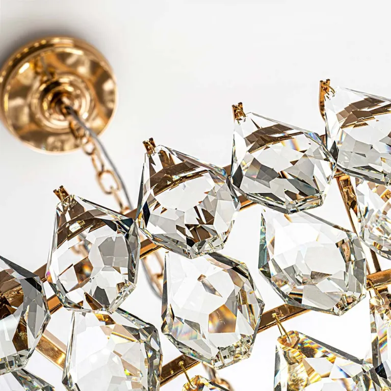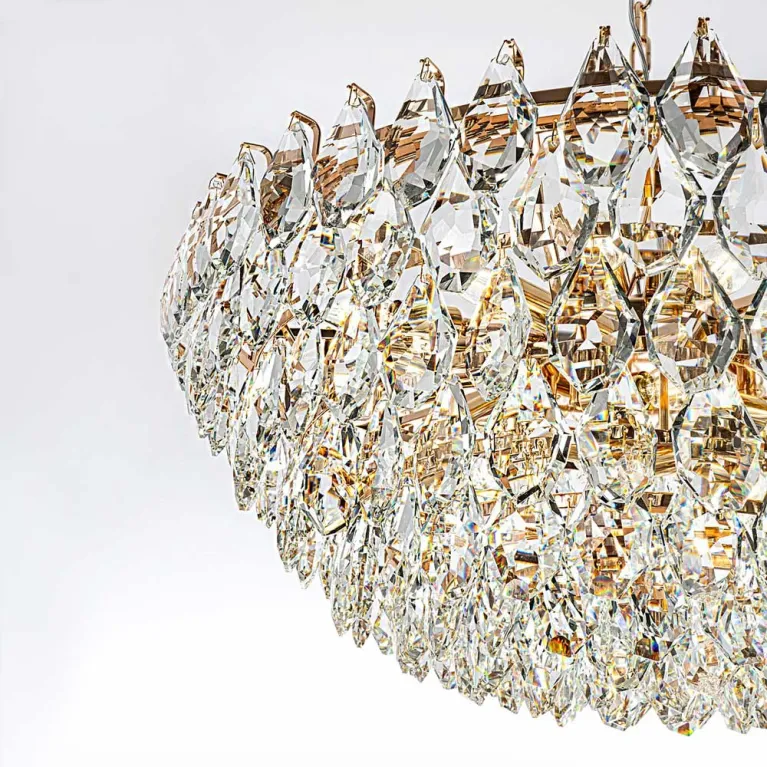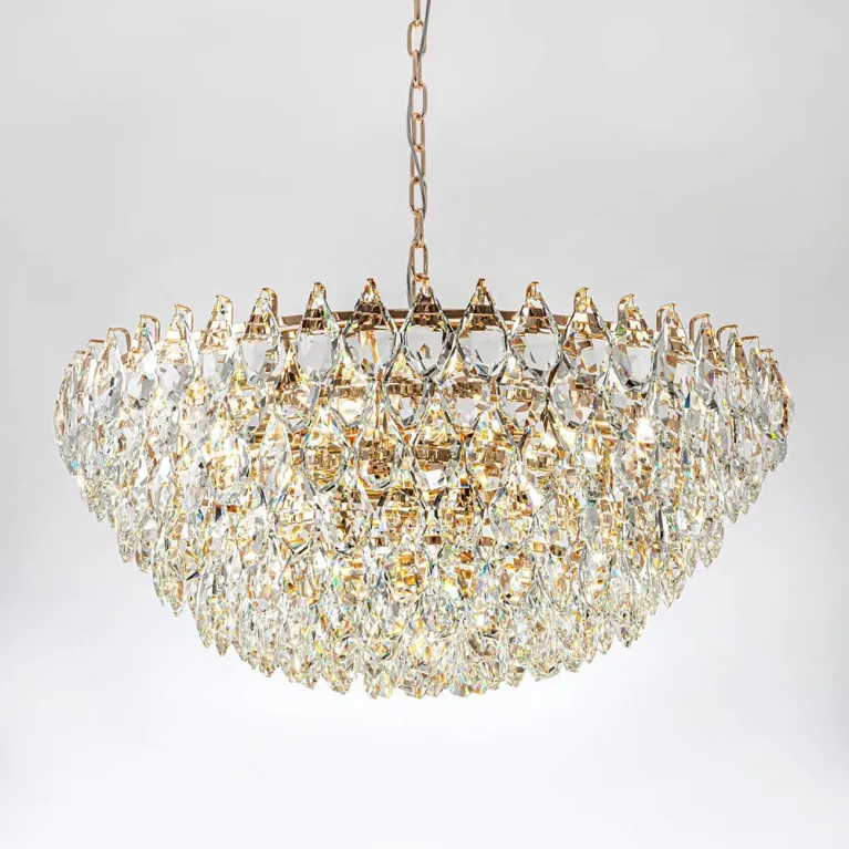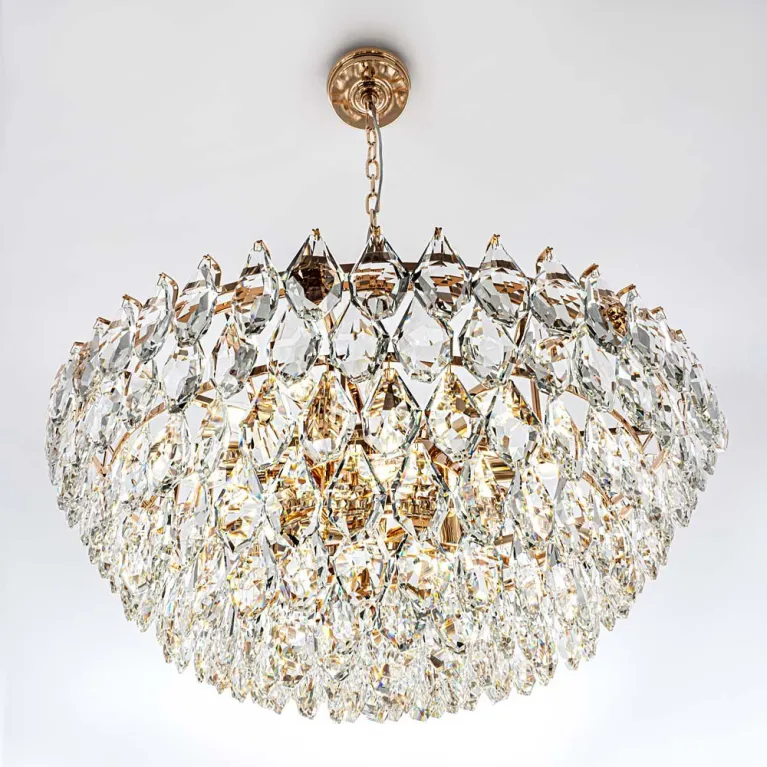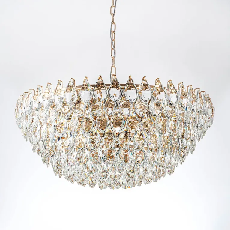 Преобладающий цвет плафонов: Прозрачный, арматуры: Золото; материал изготовления арматуры: Металл, размеры, мм: / высота 1895 / диаметр 800. Общая мощность – 960 Ватт. Основной тип ламп, предусмотренный производителем: Накаливания с цоколем E14. В зависимости от предпочтений можно использовать лампы теплового, холодного или нейтрального света, за исключением люстр с типом цоколя LED.