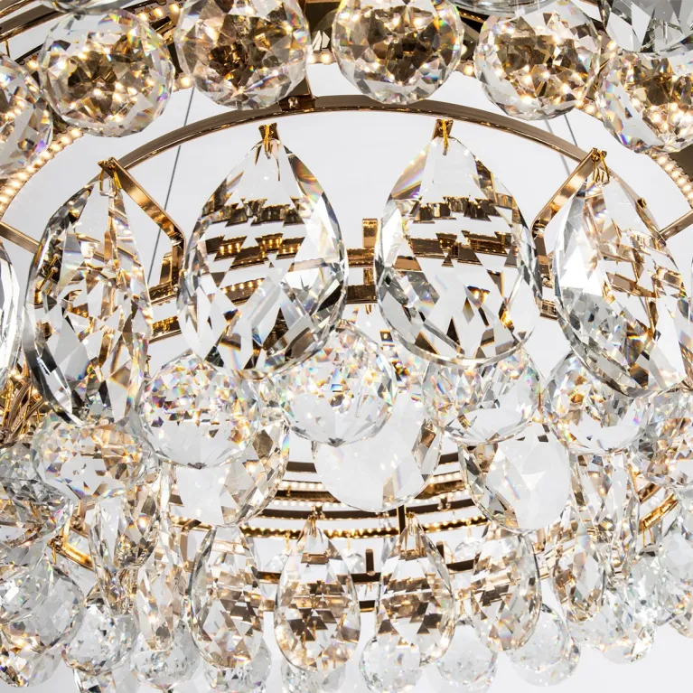 Преобладающий цвет плафонов: Прозрачный, арматуры: Золото; материал изготовления арматуры: Металл, размеры, мм: / высота 1200 / диаметр 800. Общая мощность – 95 Ватт, а максимальная площадь освещения до 25 м2. Основной тип ламп, предусмотренный производителем: Светодиодная с цоколем LED. В зависимости от предпочтений можно использовать лампы теплового, холодного или нейтрального света, за исключением люстр с типом цоколя LED.