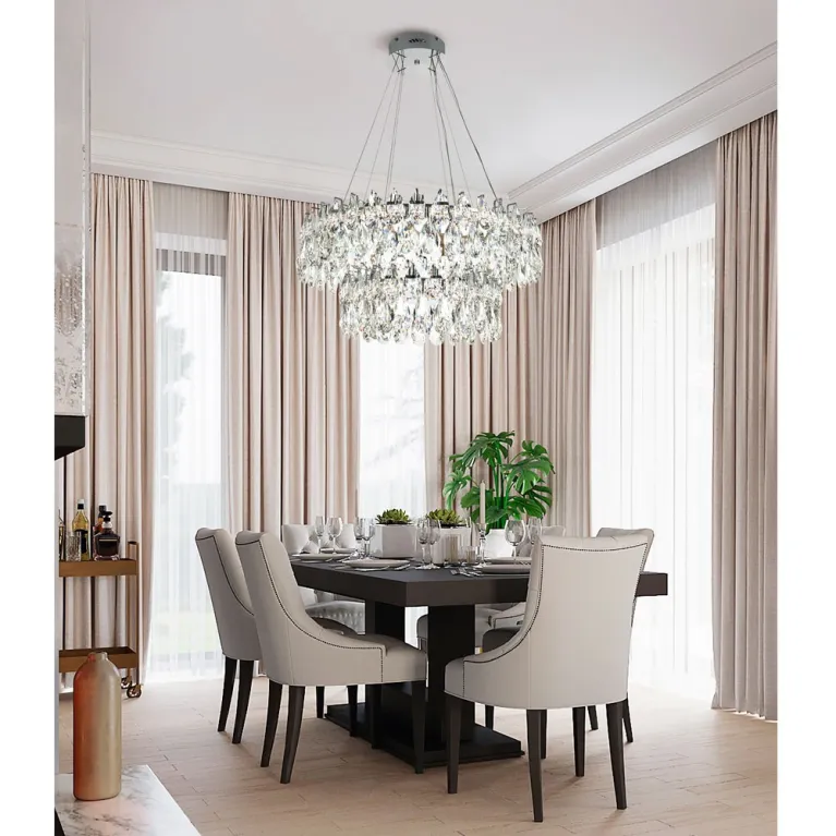 Преобладающий цвет плафонов: Прозрачный, арматуры: Хром; материал изготовления арматуры: Металл, размеры, мм: / высота 1500 / диаметр 800. Общая мощность – 96 Ватт, а максимальная площадь освещения до 22 м2. Основной тип ламп, предусмотренный производителем: Светодиодная с цоколем LED. В зависимости от предпочтений можно использовать лампы теплового, холодного или нейтрального света, за исключением люстр с типом цоколя LED.