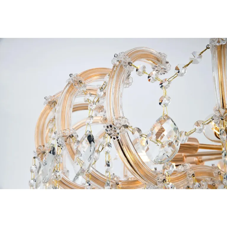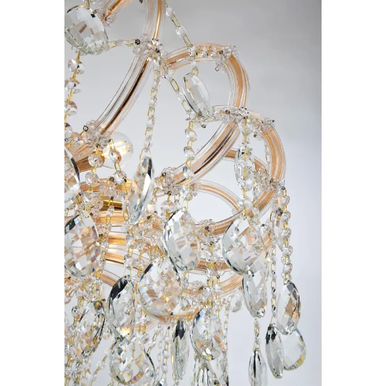Преобладающий цвет плафонов: Прозрачный, арматуры: Золото; материал изготовления арматуры: Металл, размеры, мм: / высота 970 / диаметр 960. Общая мощность – 600 Ватт. Основной тип ламп, предусмотренный производителем: Накаливания с цоколем E14. В зависимости от предпочтений можно использовать лампы теплового, холодного или нейтрального света, за исключением люстр с типом цоколя LED.