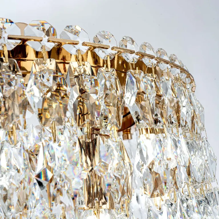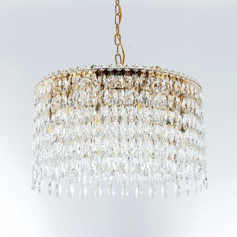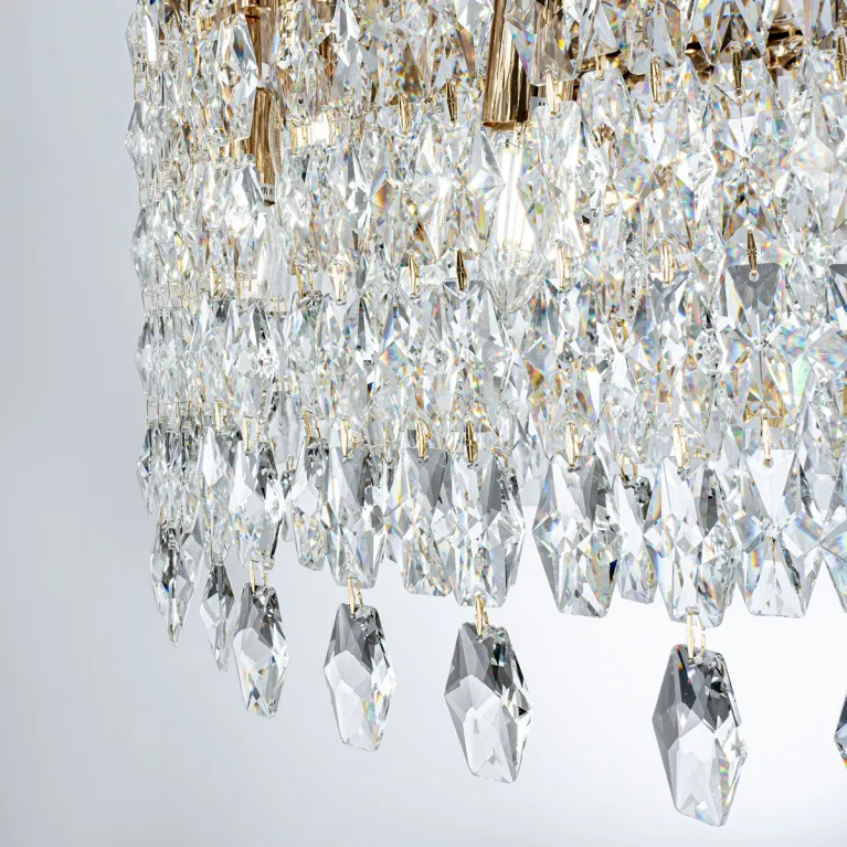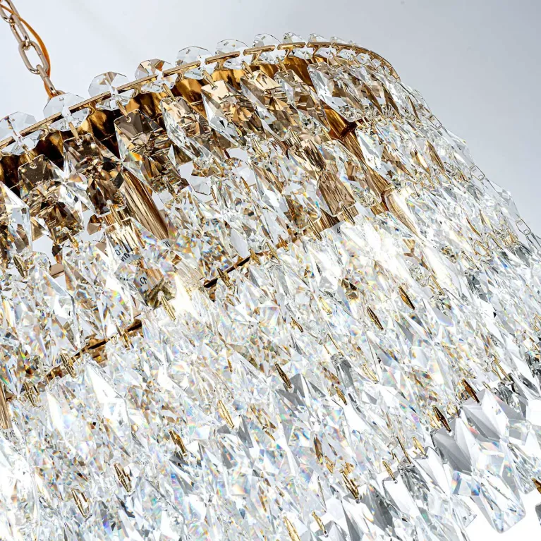 Преобладающий цвет плафонов: Прозрачный, арматуры: Золото; материал изготовления арматуры: Металл, размеры, мм: / высота 1000 / диаметр 600. Общая мощность – 480 Ватт. Основной тип ламп, предусмотренный производителем: Накаливания с цоколем E14. В зависимости от предпочтений можно использовать лампы теплового, холодного или нейтрального света, за исключением люстр с типом цоколя LED.