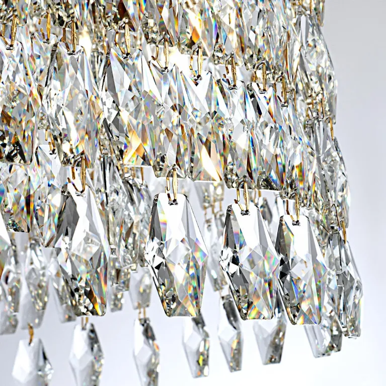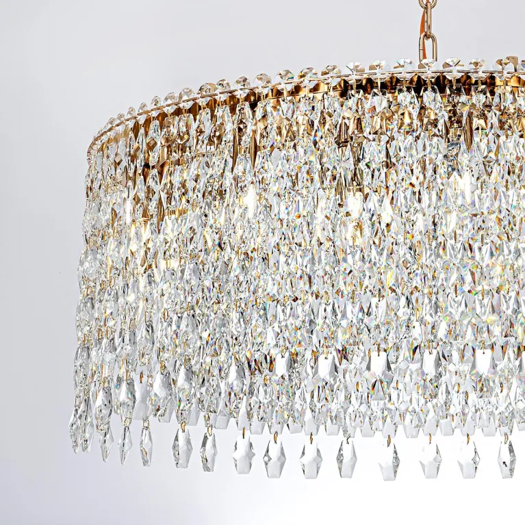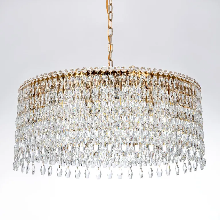 Преобладающий цвет плафонов: Прозрачный, арматуры: Золото; материал изготовления арматуры: Металл, размеры, мм: / высота 1000 / диаметр 800. Общая мощность – 720 Ватт, а максимальная площадь освещения до 20 м2. Основной тип ламп, предусмотренный производителем: Накаливания с цоколем E14. В зависимости от предпочтений можно использовать лампы теплового, холодного или нейтрального света, за исключением люстр с типом цоколя LED.