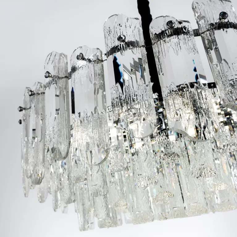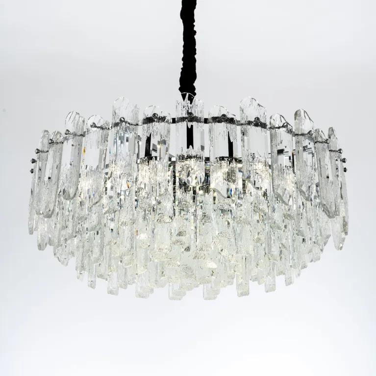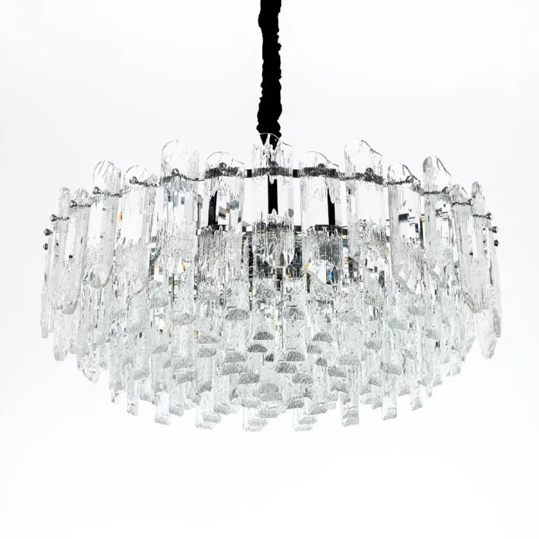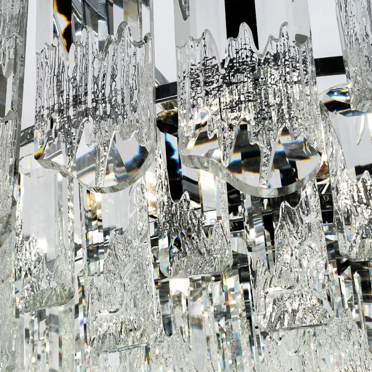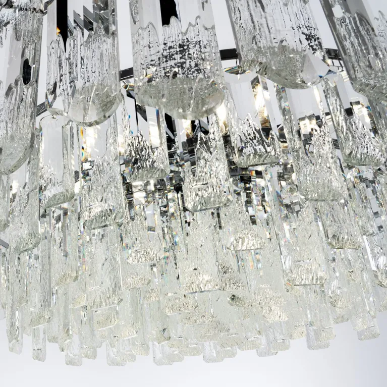 Преобладающий цвет плафонов: Прозрачный, арматуры: Хром; материал изготовления арматуры: Металл, размеры, мм: / высота 1000 / диаметр 600. Общая мощность – 480 Ватт. Основной тип ламп, предусмотренный производителем: Накаливания с цоколем E14. В зависимости от предпочтений можно использовать лампы теплового, холодного или нейтрального света, за исключением люстр с типом цоколя LED.