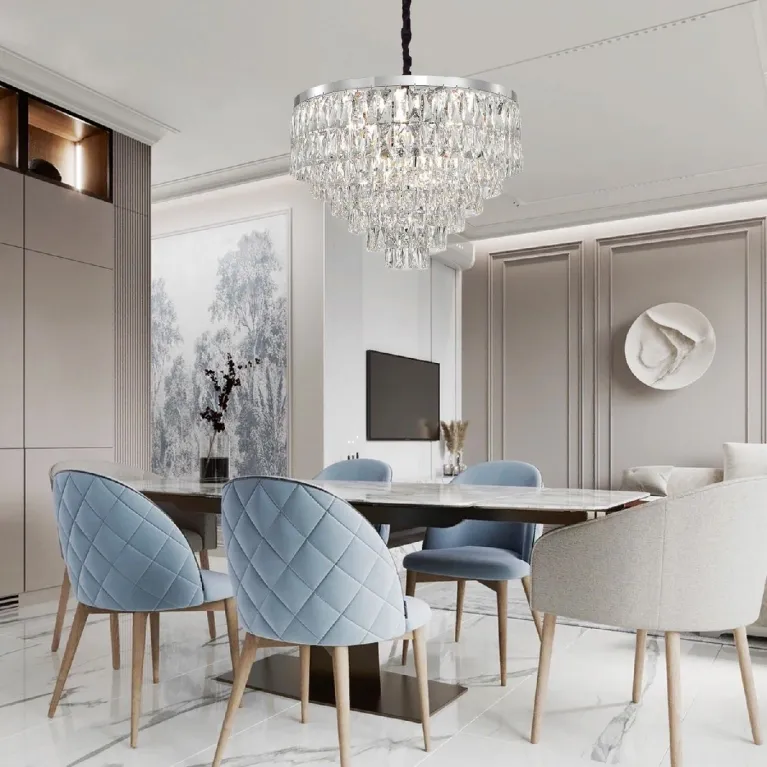 Преобладающий цвет плафонов: Прозрачный, арматуры: Хром; материал изготовления арматуры: Металл, размеры, мм: / высота 1150 / диаметр 570. Общая мощность – 480 Ватт, а максимальная площадь освещения до 22 м2. Основной тип ламп, предусмотренный производителем: Накаливания с цоколем E14. В зависимости от предпочтений можно использовать лампы теплового, холодного или нейтрального света, за исключением люстр с типом цоколя LED.