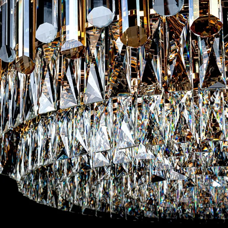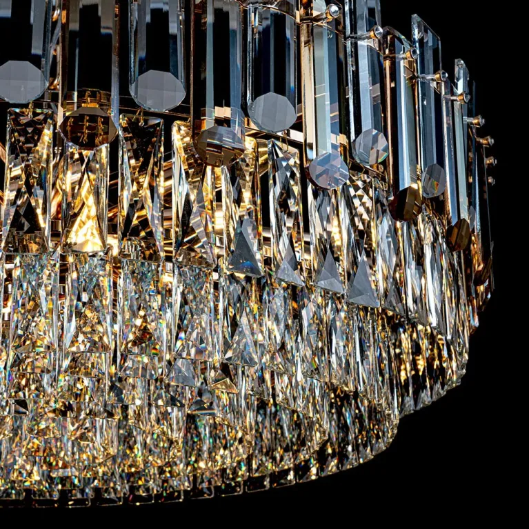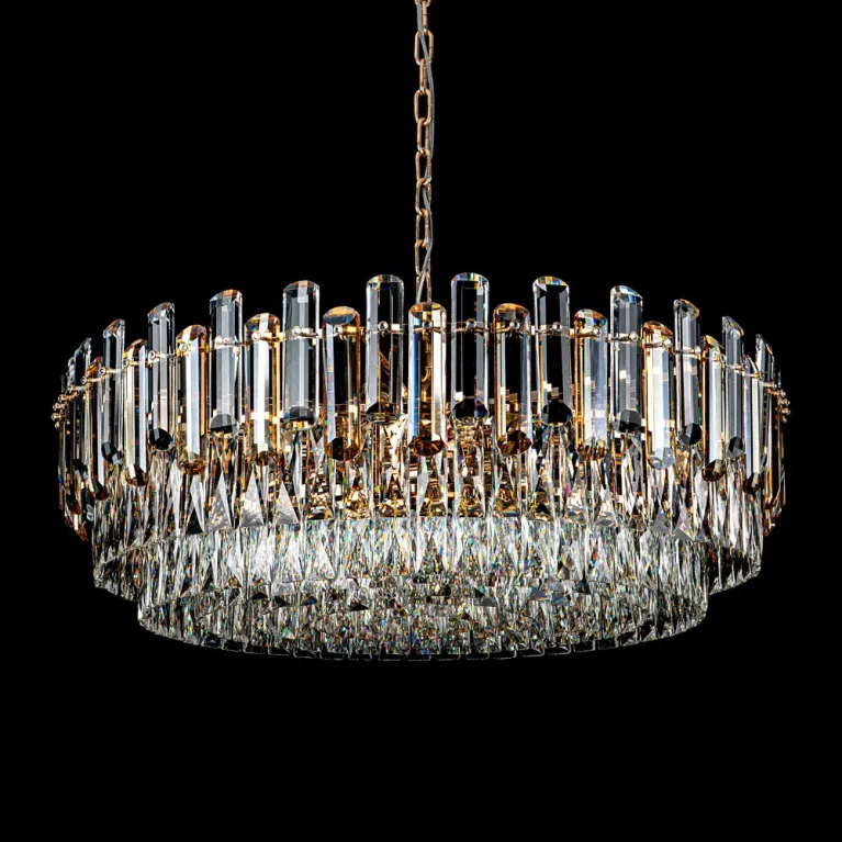 Преобладающий цвет плафонов: Прозрачный, арматуры: Золото; материал изготовления арматуры: Металл, размеры, мм: / высота 1050 / диаметр 800. Общая мощность – 640 Ватт, а максимальная площадь освещения до 25 м2. Основной тип ламп, предусмотренный производителем: Накаливания с цоколем E14. В зависимости от предпочтений можно использовать лампы теплового, холодного или нейтрального света, за исключением люстр с типом цоколя LED.