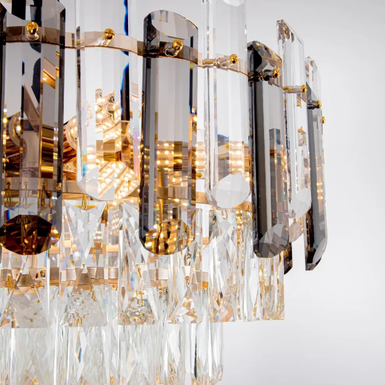Преобладающий цвет плафонов: Дымчатый, арматуры: Золото; материал изготовления арматуры: Металл, размеры, мм: / высота 1050 / диаметр 500. Общая мощность – 360 Ватт, а максимальная площадь освещения до 20 м2. Основной тип ламп, предусмотренный производителем: Накаливания с цоколем E14. В зависимости от предпочтений можно использовать лампы теплового, холодного или нейтрального света, за исключением люстр с типом цоколя LED.