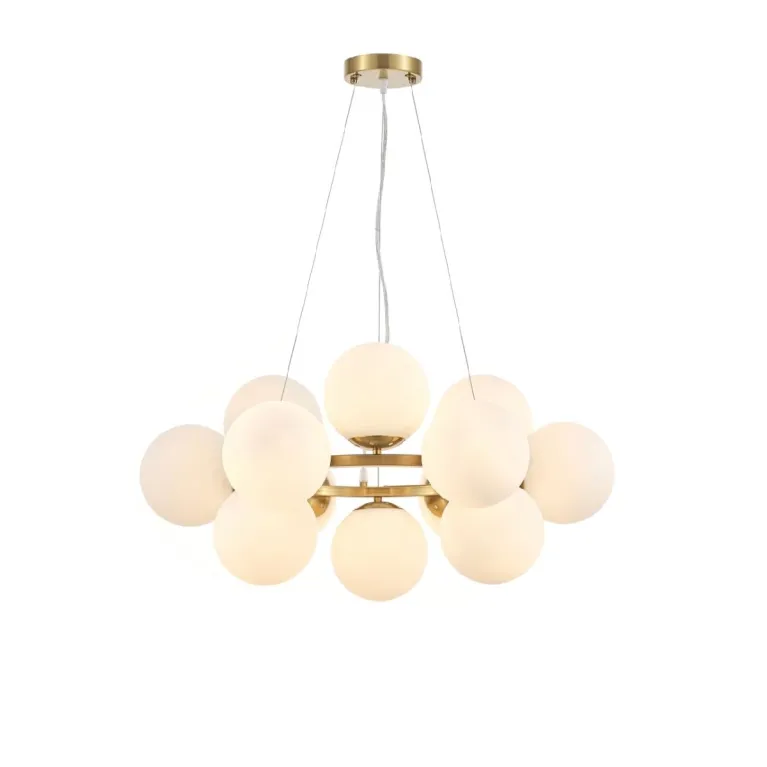 Преобладающий цвет плафонов: Белый, арматуры: Латунь; материал изготовления арматуры: Металл, размеры, мм: / высота 1120 / диаметр 710. Общая мощность – 720 Ватт, а максимальная площадь освещения до 15 м2. Основной тип ламп, предусмотренный производителем: Накаливания с цоколем E27. В зависимости от предпочтений можно использовать лампы теплового, холодного или нейтрального света, за исключением люстр с типом цоколя LED.