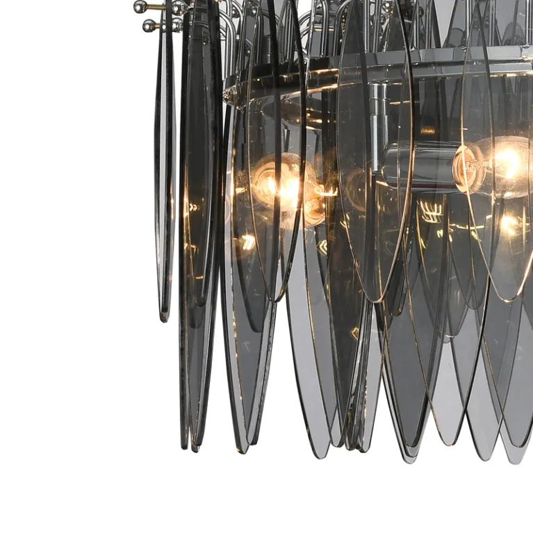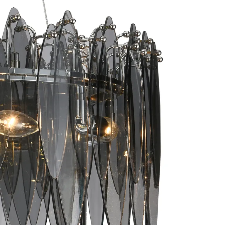 Преобладающий цвет плафонов: Дымчатый, арматуры: Хром; материал изготовления арматуры: Металл, размеры, мм: / высота 290 / диаметр 600. Общая мощность – 320 Ватт, а максимальная площадь освещения до 25 м2. Основной тип ламп, предусмотренный производителем: Накаливания с цоколем E14. В зависимости от предпочтений можно использовать лампы теплового, холодного или нейтрального света, за исключением люстр с типом цоколя LED.