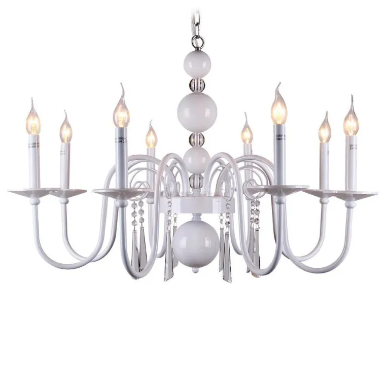 Люстра оснащена восемью лампами, что обеспечивает яркое и равномерное освещение. Она идеально подходит для помещений с высокими потолками благодаря своей высоте в 122 см. Основание выполнено из прочного металла, что гарантирует долговечность и надежность конструкции.