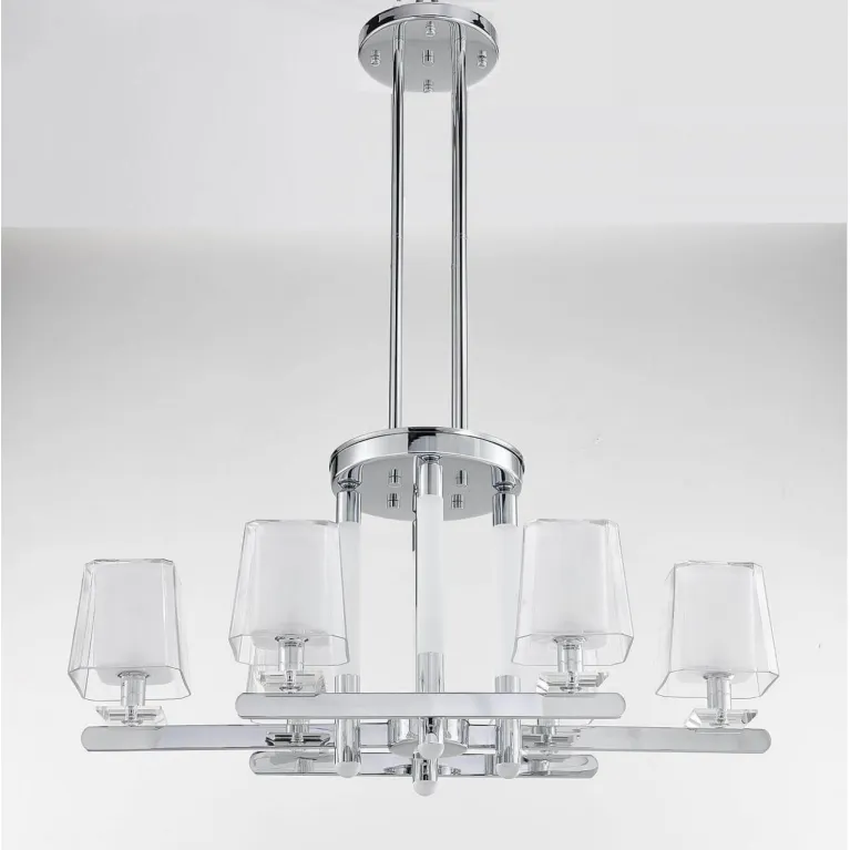 Корпус люстры выполнен из высококачественного металла и имеет стильное хромированное покрытие, придающее изделию современный и элегантный вид. Плафоны изготовлены из прочного и долговечного акрила, что гарантирует долгий срок службы и сохранение первоначального внешнего вида.