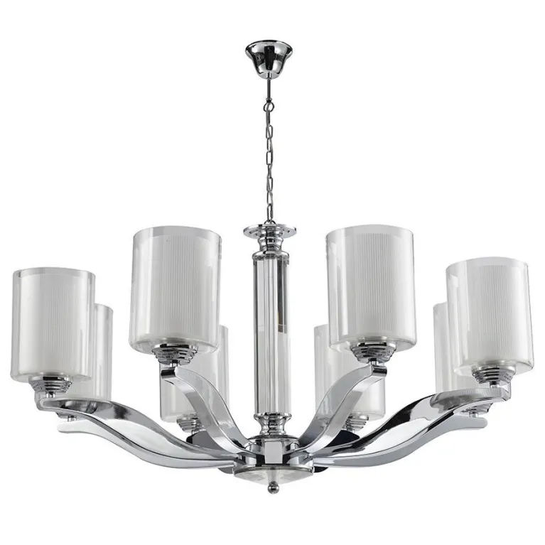 Люстра оснащена восемью лампами, что обеспечивает яркое и равномерное освещение пространства. Она идеально подходит для просторных гостиной, столовой или спальни, добавляя им роскоши и уюта. Основание выполнено из прочного металла, что гарантирует долговечность и надежность конструкции.
