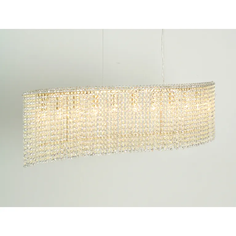 Преобладающий цвет плафонов: Прозрачный, арматуры: Золото; материал изготовления арматуры: Металл, размеры, мм: длина 1280 / ширина 300 / высота 2500 Общая мощность – 660 Ватт. Основной тип ламп, предусмотренный производителем: Накаливания с цоколем E14. В зависимости от предпочтений можно использовать лампы теплового, холодного или нейтрального света, за исключением люстр с типом цоколя LED.