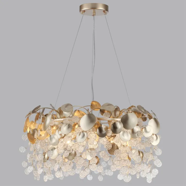 Преобладающий цвет плафонов: Прозрачный, арматуры: Золото; материал изготовления арматуры: Металл, размеры, мм: / высота 1335 / диаметр 600. Общая мощность – 320 Ватт, а максимальная площадь освещения до 16 м2. Основной тип ламп, предусмотренный производителем: Накаливания с цоколем E14. В зависимости от предпочтений можно использовать лампы теплового, холодного или нейтрального света, за исключением люстр с типом цоколя LED.
